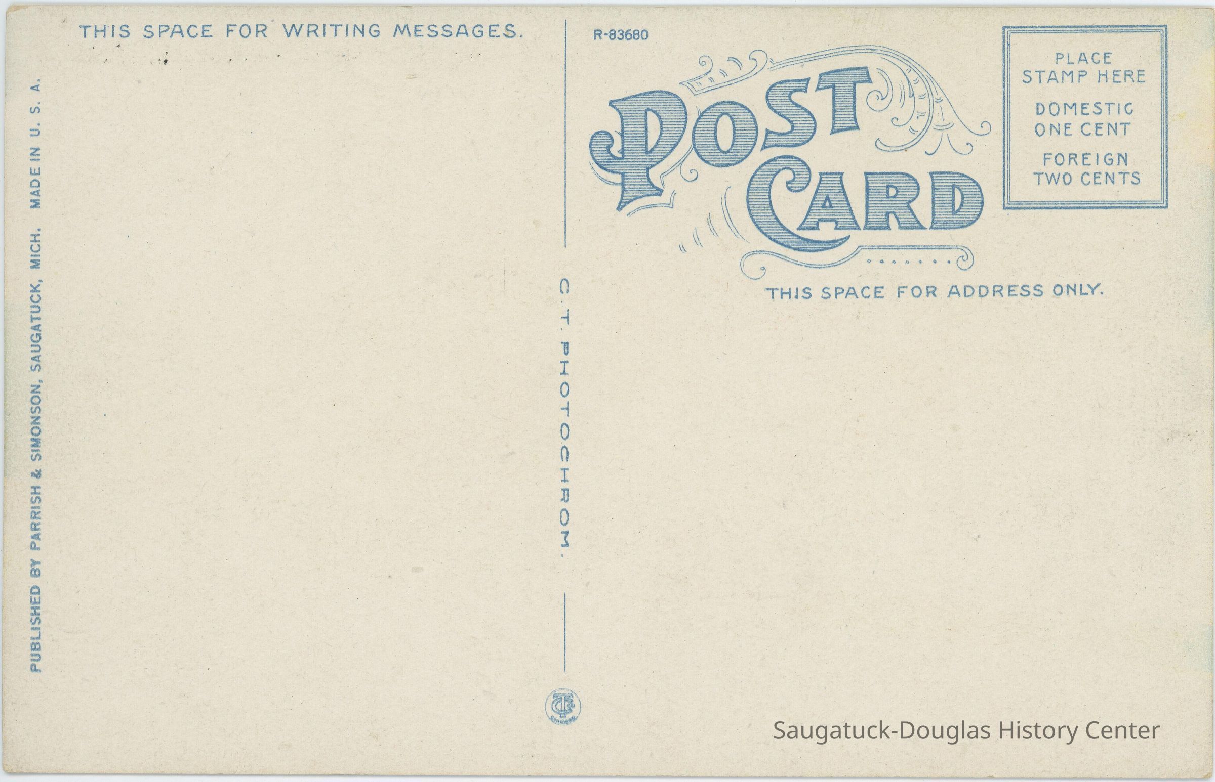 A color postcard showing a street view of Main St in Saugatuck, Michigan. Two cars are parallel parked in front of the drug store. People stand on the corner of the street in the background.