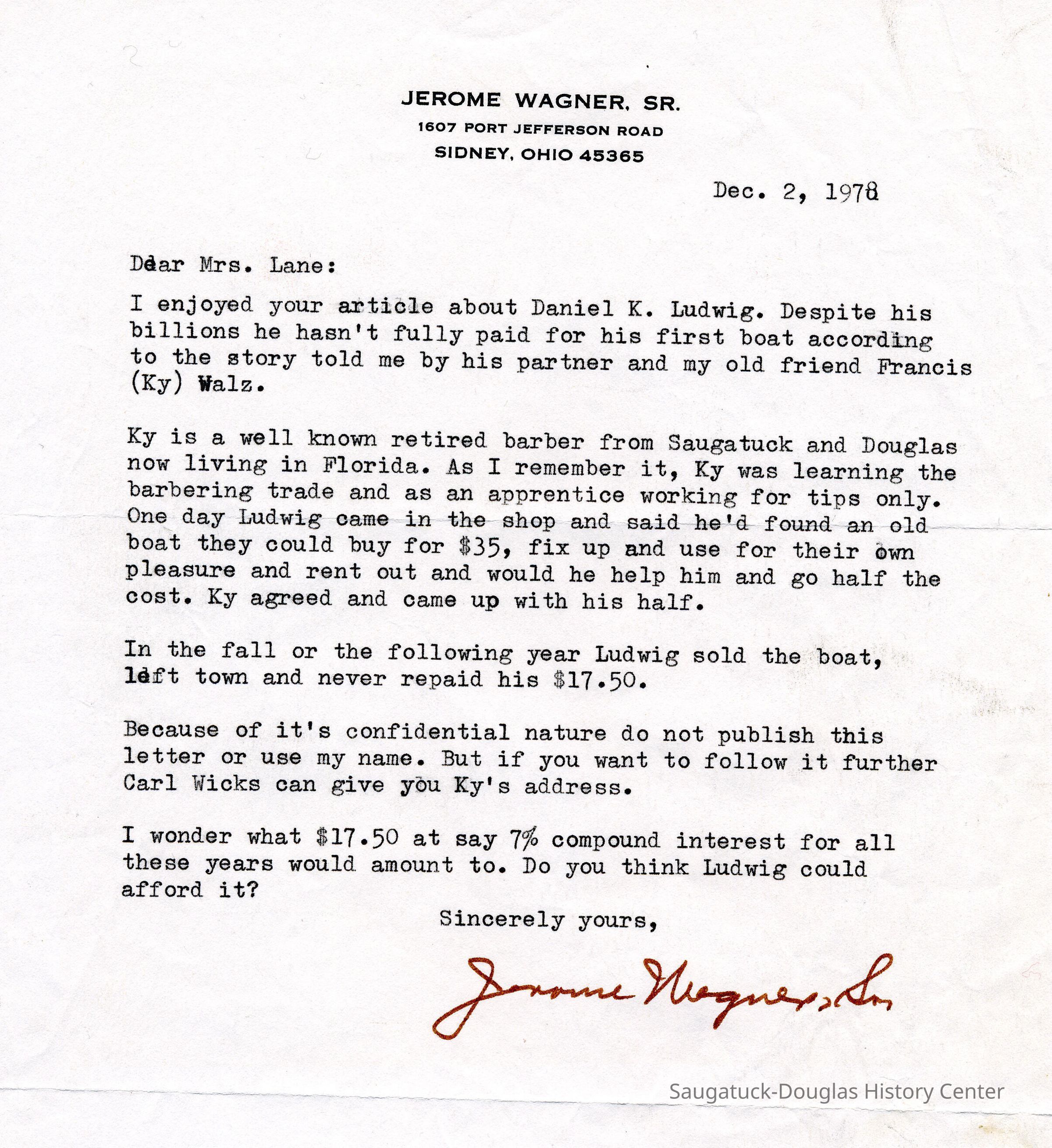 SAUGATUCK’S RICHEST MAN In 1976 after the death of Howard Hughes and J. Paul Getty, Daniel Keith Ludwig was proclaimed by the New York Times to be the richest man in the world and there is no doubt that he was a world class mega-billionaire! What most do not know is that Daniel Keith Ludwig– born in South Haven in 1897 – moved with his mother Flora Belle and his father Daniel L. Ludwig to Saugatuck at the age of seven and grew up right here on Hoffman St. He got his start shining shoes and selling popcorn in the Big Pavilion. His father, nicknamed “Lud” was a sailor, and a businessman who made a living selling real estate and dabbling in business ventures, including a partial ownership interest in the Pavilion. According to a 1978 Commercial Record article by Kit Lane (who wrote a book titled The Popcorn Millionaire and Other Tales of Saugatuck), Keith Ludwig exhibited entrepreneurial talent at a young age--besides sellling popcorn, he managed the finances for the local ball team, bought an old boat, which he and Ky Walz rebuilt and sold for a profit. He was remembered as a likeable but disinterested student in the class of Mrs. Carl Bird. Elita Bird, a classmate remembered that Keith was interested in candy sales at the Bird Drugstore. Keith was a member of a group called “Whits Boys,” a YMCA type group organized by Charles F. Whitcomb who lived on Holland St. His parents separated when he was in the eighth grade—he then quit school and went to Port Arthur Texas with his father. At age 19, he left Texas to return north, where he bought a dilapidated Lake Michigan cruise vessel for $5000 which he converted to a barge bulk carrier to haul molasses. In the next 20 years he proceeded to make his fortune--first by buying and leasing tanker ships, then building ships during WWll and ultimately established a diversified world-wide empire that included major interests in oil refining, coal mining, salt water conversion, agriculture, real estate, finance and banking. He was always somewhat of a loner and shunned publicity. In his most publicized venture, he invested billions in an unsuccessful timber farming venture (the “Jari Project”) in the Amazon. When he died in 1992, he had no living descendents, and most of his fortune was left to his Cancer research foundation. By Jack Sheridan