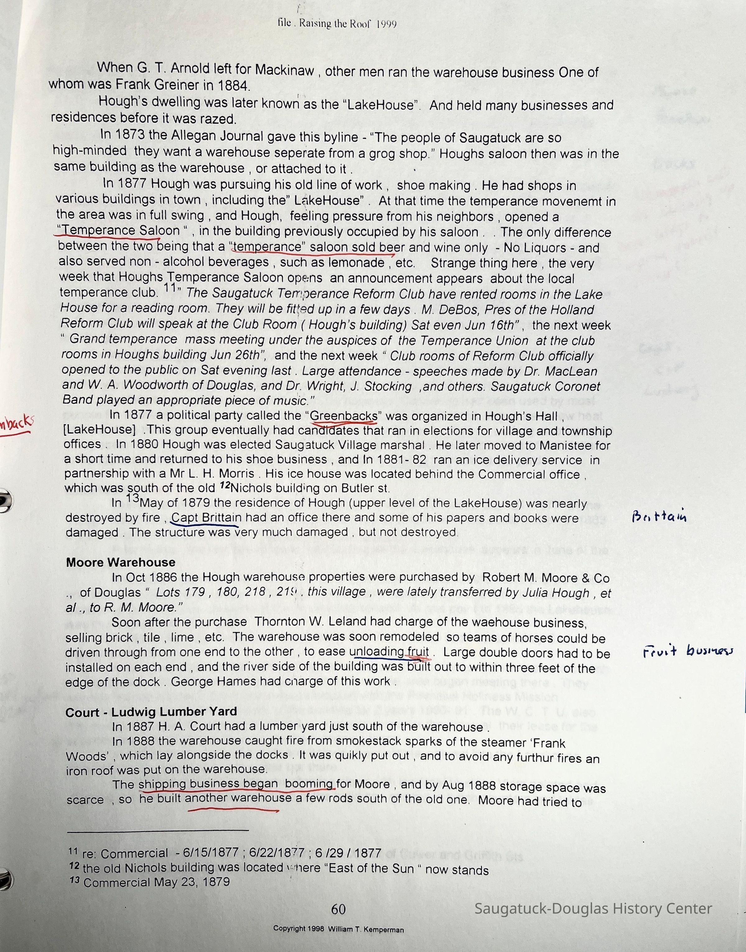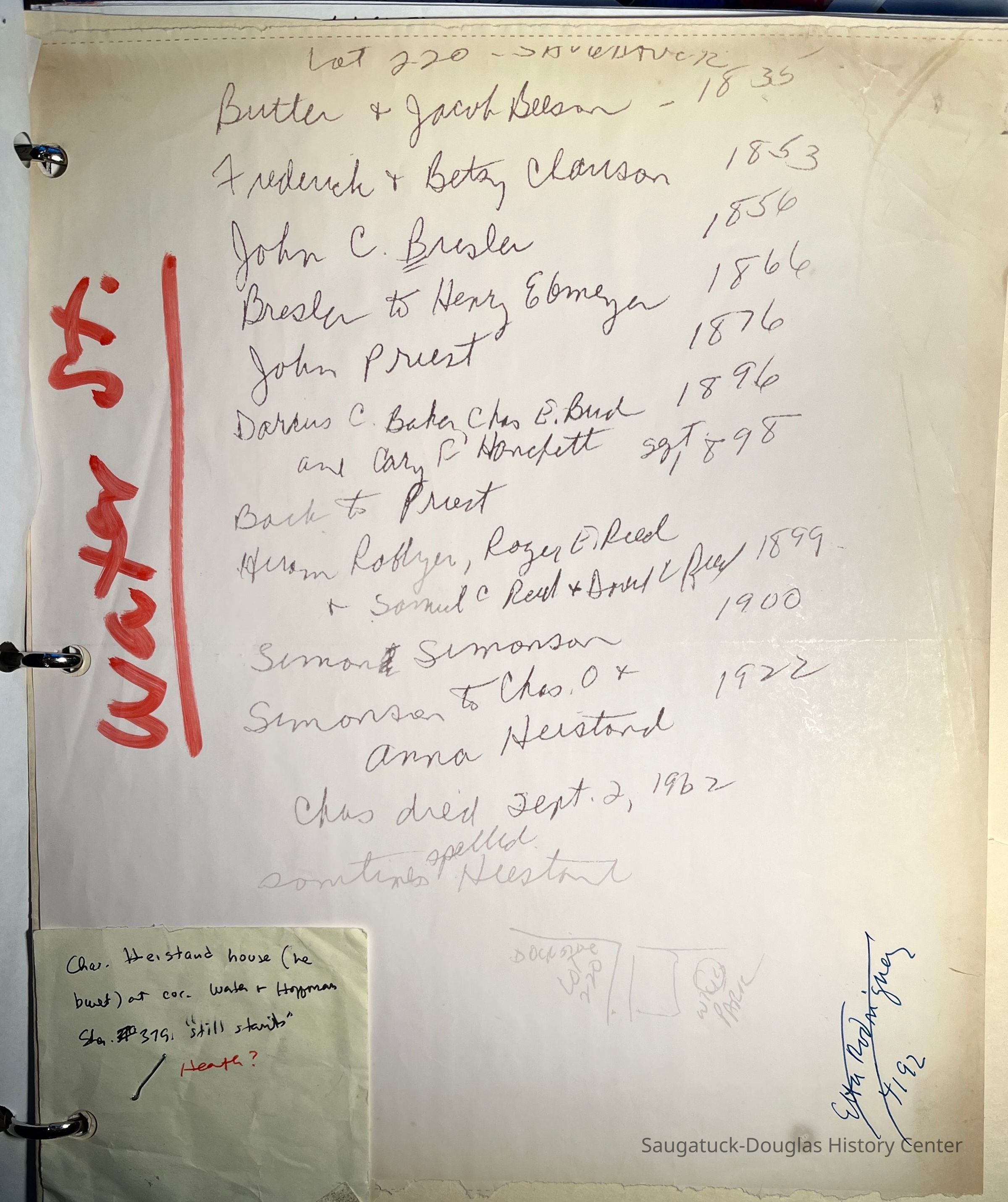 This primary-sourced data tracked the Saugatuck locations and ownership of business and residence in the 1800s. It informed Jim Schmiechen's book "Raising the Roof: A History of the Buildings And Architecture in the Saugatuck And Douglas Area" and the SDHS's 1999 museum exhibit of the same name.