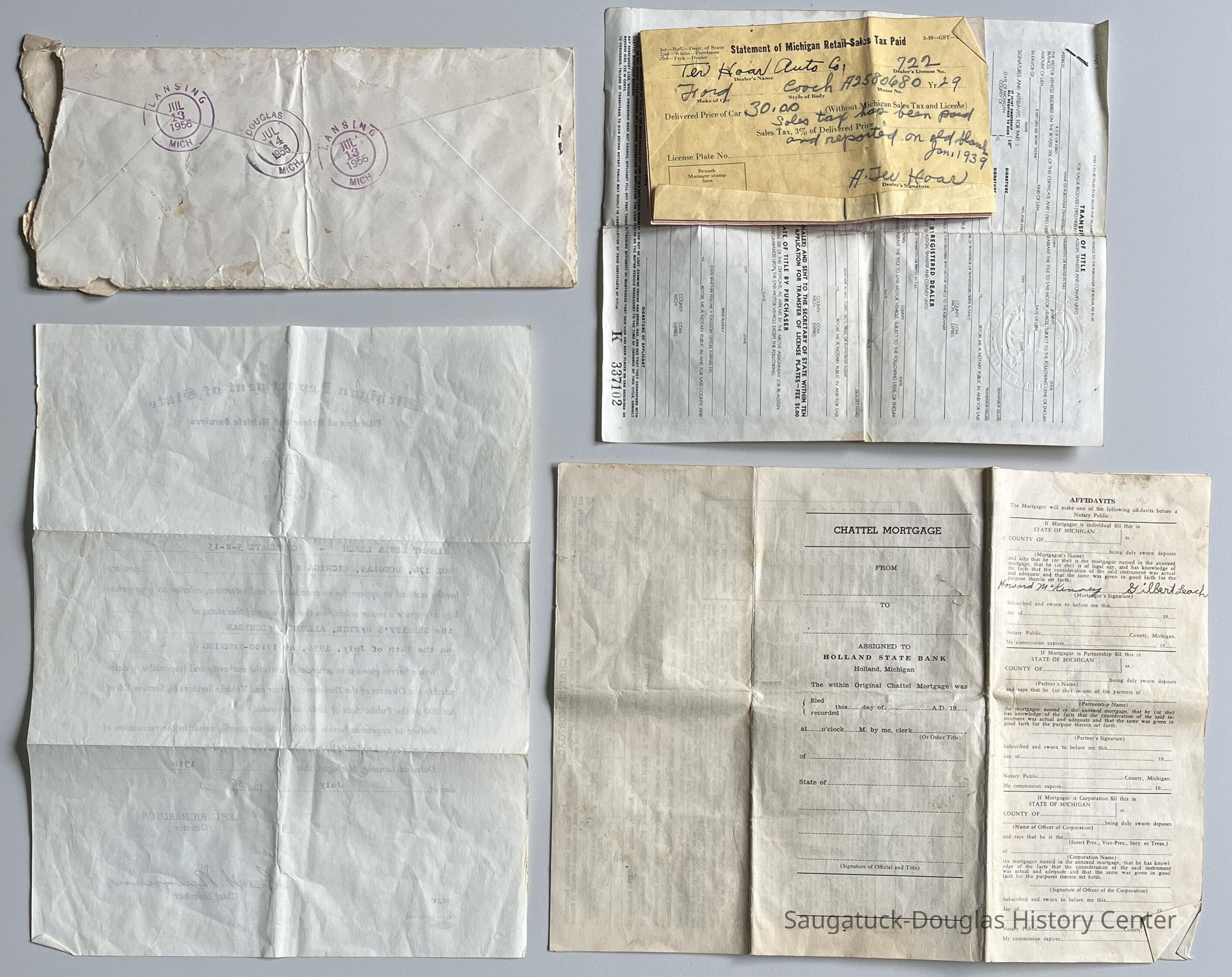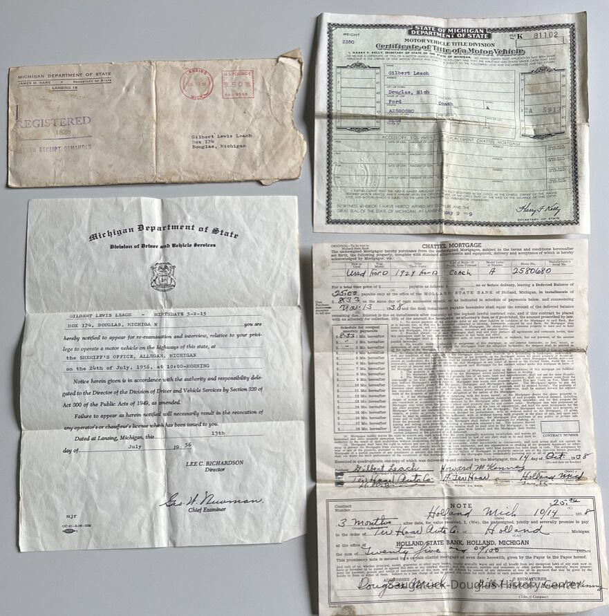 1. Certificate of Title of a Motor Vehicle issued to Gilbert Leach of Douglas, Michigan for a Model A. Ford on May 9, 1939. Stapled to back of document is a receipt for sales tax paid from Ter Haar Auto Company in Holland. Total purchase $30.