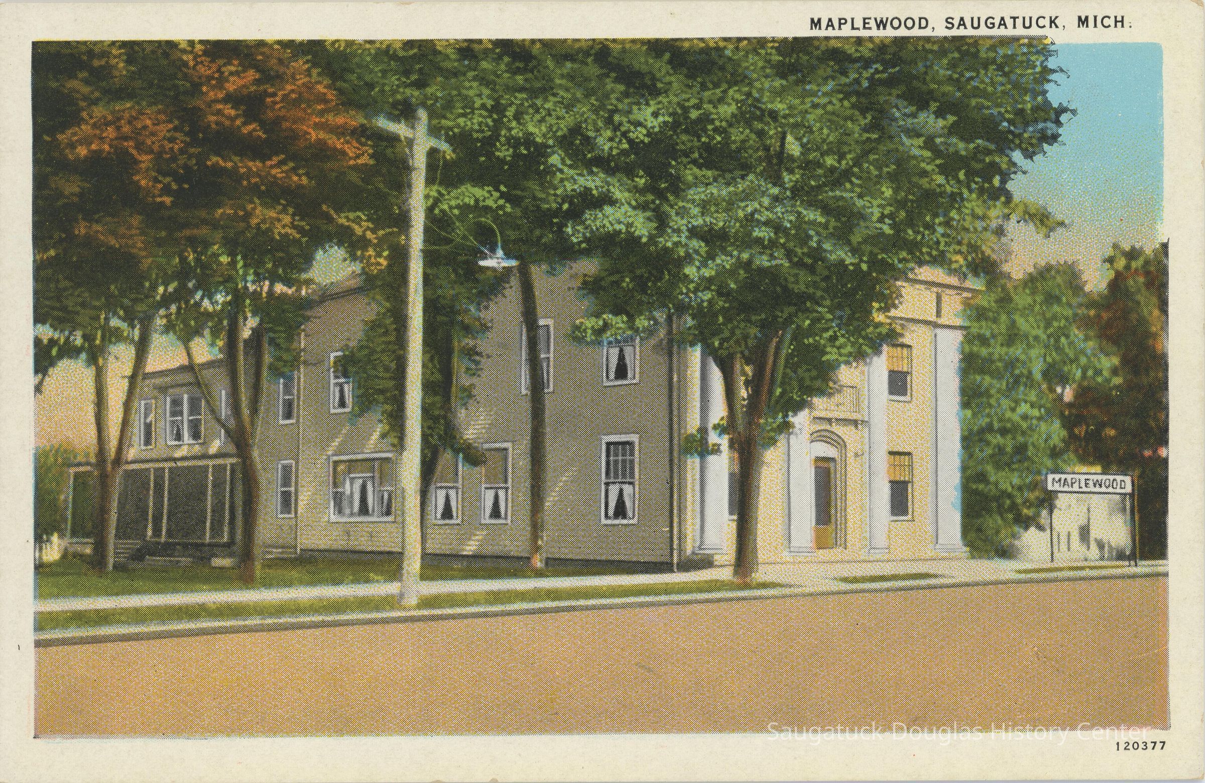 Linen color postcard showing the Maplewood Hotel from the street. Four column make up the façade of the building with a porch visible in the back.