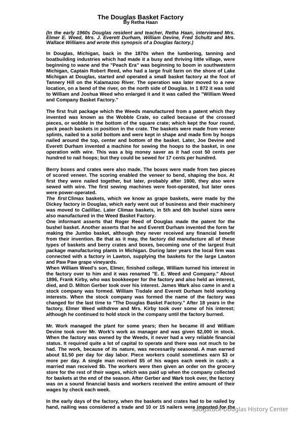 Haan essay text extracted from PDF: In Douglas, Michigan, back in the 1870s when the lumbering, tanning and boatbuilding industries which had made it a busy and thriving little village, were beginning to wane and the "Peach Era" was beginning to boom in southwestern Michigan, Captain Robert Reed, who had a large fruit farm on the shore of Lake Michigan at Douglas, started and operated a small basket factory at the foot of Tannery Hill on the Kalamazoo River. The operation was later moved to a new location, on a bend of the river, on the north side of Douglas. In 1 872 it was sold to William and Joshua Weed who enlarged it and it was called the "William Weed and Company Basket Factory." The first fruit package which the Weeds manufactured from a patent which they invented was known as the Wobble Crate, so called because of the crossed pieces, or wobble in the bottom of the square crate; which kept the four round, peck peach baskets in position in the crate. The baskets were made from veneer splints, nailed to a solid bottom and were kept in shape and made firm by hoops nailed around the top, center and bottom of the basket. Later, Joe Devine and Everett Durham invented a machine for sewing the hoops to the basket, in one operation with wire. This was a big money saver as it had cost 50 cents per hundred to nail hoops; but they could be sewed for 17 cents per hundred. Berry boxes and crates were also made. The boxes were made from two pieces of scored veneer. The scoring enabled the veneer to bend, shaping the box. At first they were nailed together, but later, probably after 1900, they also were sewed with wire. The first sewing machines were foot-operated, but later ones were power-operated. The first Climax baskets, which we know as grape baskets, were made by the Dickey factory in Douglas, which early went out of business and their machinery was moved to Cadillac. Later Climax baskets, in 5th and 6th bushel sizes were also manufactured in the Weed Basket Factory. One informant asserts that Roger Reed of Douglas made the patent for the bushel basket. Another asserts that he and Everett Durham invented the form far making the Jumbo basket, although they never received any financial benefit from their invention. Be that as it may, the factory did manufacture all of these types of baskets and berry crates and boxes, becoming one of the largest fruit package manufacturing plants in Michigan. During later years the local firm was connected with a factory in Lawton, supplying the baskets for the large Lawton and Paw Paw grape vineyards. When William Weed's son, Elmer, finished college, William turned his interest in the factory over to him and it was renamed "E. E. Weed and Company." About 1896, Frank Kirby, who was bookkeeper for the factory and also held an interest, died, and D. Milton Gerber took over his interest. James Wark also came in and a stock company was formed. William Tisdale and Everett Durham held working interests. When the stock company was formed the name of the factory was changed for the last time to "The Douglas Basket Factory." After 18 years in the factory, Elmer Weed withdrew and Mrs. Kirby took over some of his interest; although he continued to hold stock in the company until the factory burned. Mr. Work managed the plant for some years; then he became ill and William Devine took over Mr. Work's work as manager and was given $2,000 in stock. When the factory was owned by the Weeds, it never had a very reliable financial status. It required quite a lot of capital to operate and there was not much to be had. The work, because of its nature, was necessarily seasonal. A man earned about $1.50 per day for day labor. Piece workers could sometimes earn $3 or more per day. A single man received $5 of his wages each week in cash; a married man received $b. The workers were then given an order on the grocery store for the rest of their wages, which was paid up when the company collected for baskets at the end of the season. After Gerber and Wark took over, the factory was on a sound financial basis and workers received the entire amount of their wages by check each week. In the early days of the factory, when the baskets and crates had to be nailed by hand, nailing was considered a trade and 10 or 15 nailers were imported for the summer. They were rather rough individuals, heavy drinkers, and they followed the crop from place to place, very much the same as tramp coopers. They began about May 1 and worked until about October 1. About 25 or 30 women also worked at nailing. The factory continued to expand. About the time that Gerber and Wark became interested in the factory, they realized that the supply of local timber was nearly exhausted, so they bought 2,500 acres of timber along Swan Creek, near Allegan, and 2,500 acres along the Kalamazoo River. The logs were cut and piled on the banks of the Kalamazoo River in winter and floated and rafted to Douglas in spring and summer as needed. A raft of logs was on its way down the river when the factory burned. The work of cutting, trimming and scaling the lags, cutting the limbs into cordwood and piling same, kept a crew of 25 to 30 farmers and Indians busy in winter. Some of them then worked in the factory in the summer. The men received $2 per 1,000 feet for cutting logs and $1 per cord for 18-inch hardwood. The Indians and farmers did a good job. they felled and cut the logs to good advantage and cut and piled the wood honestly and straight. Beech and maple were used mostly for staves, elm for hoops, basswood and whitewood for berry boxes and soft maple was best for slats and covers for berry crates. The logs were sorted as to use before floating down the river. They were steamed after reaching the factory and then the veneer was cut round and round until all that was left of a log was a pole about four inches in diameter. The veneer was also scored, by the veneering machine, so it would bend and then cut into the desired size 