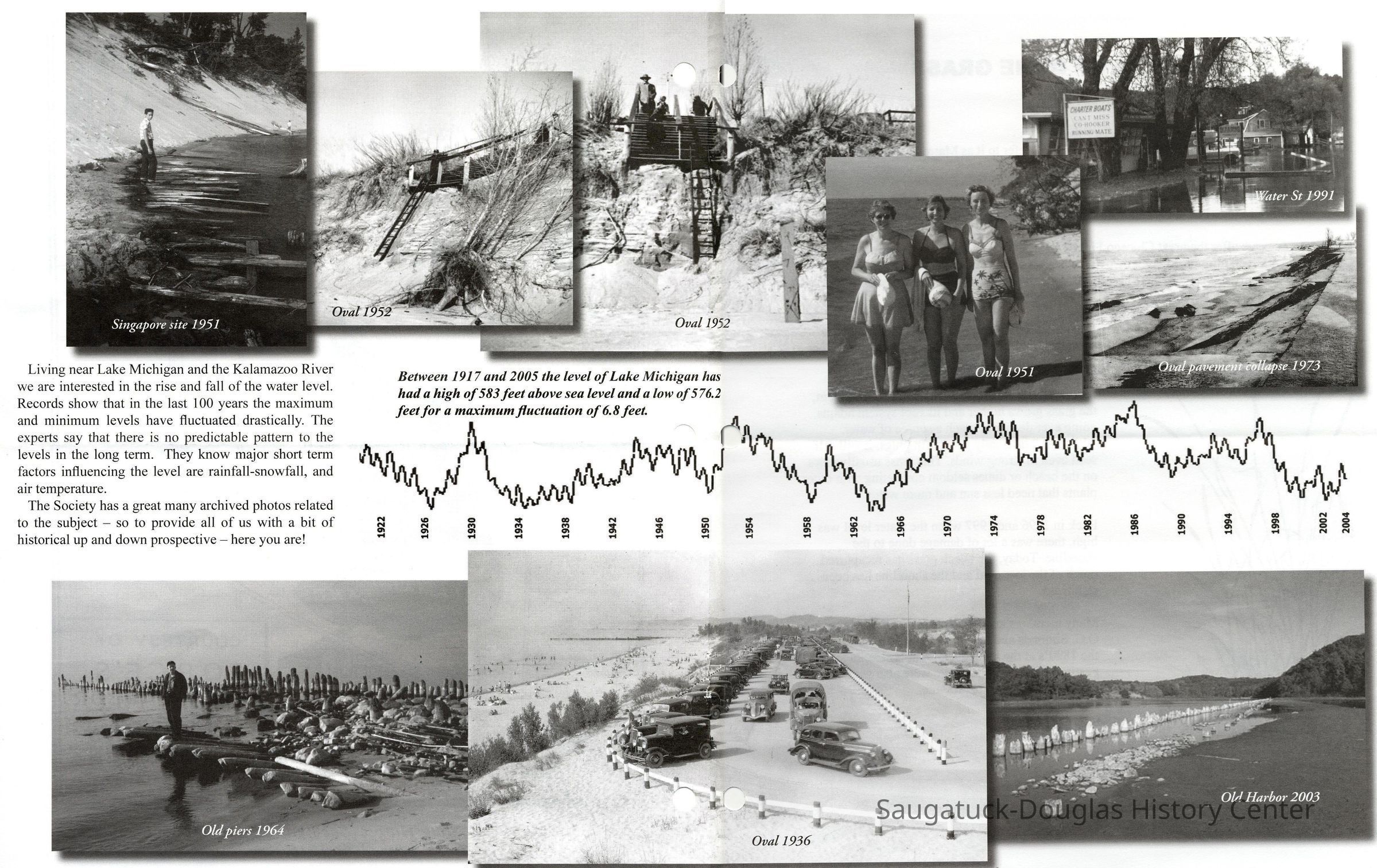 Graphic from a keynote presentation by Jack Sheridan about historic fluctuations in Lake Michigan water levels. The graphic was reprinted in the SDHS newsletter insert page 396. The graphic includes data from 1922 to 2004 plus eight photos of erosion/submerged details revealed or flooding between 1936 and 2003