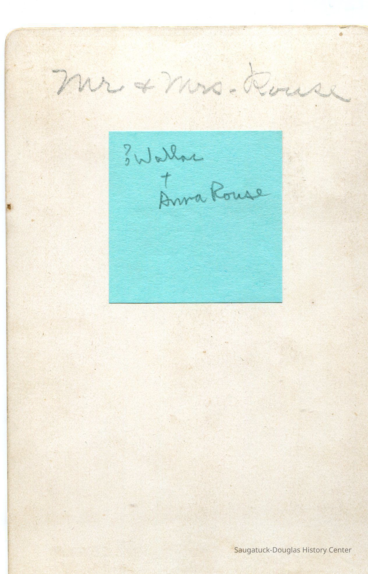 Mr. and Mrs. Rouse is written in pencil on the back along with a green post-it noting the following in cursive: Wallace and Anna Rouse.