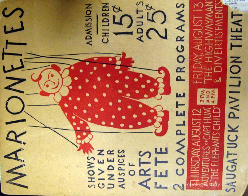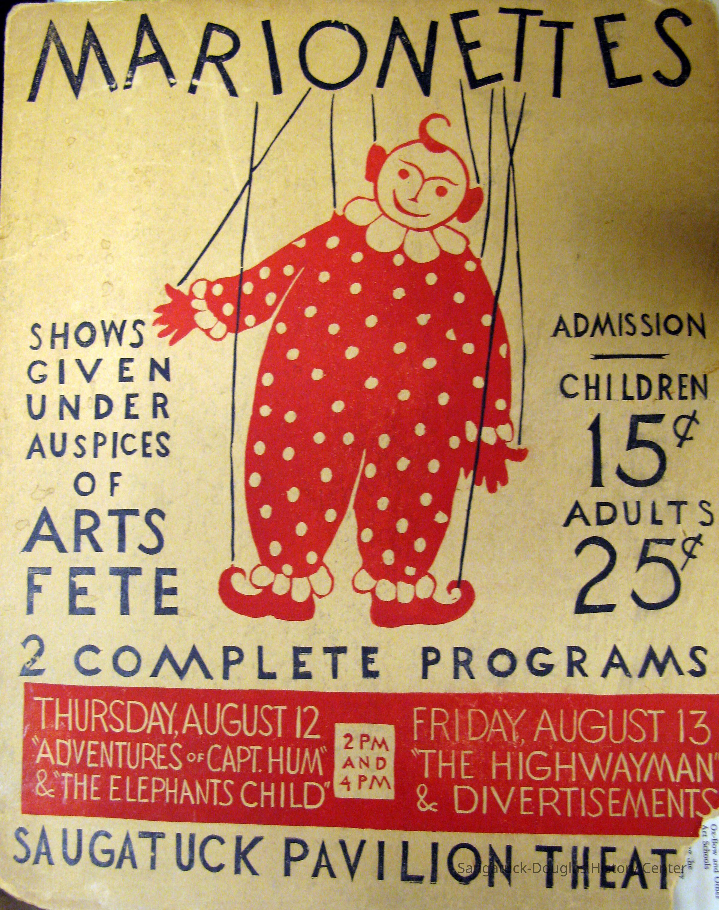 13"x16" cardboard poster advertising a Marionettes show given under the auspices of ARTS FETE 2 complete programs: Thursday, August 12 - Adventures of Capt. Hum & The Elephants Child; Friday; August 13 - "The Highwayman" & Divertisements at the Saugatuck Pavilion Theater.