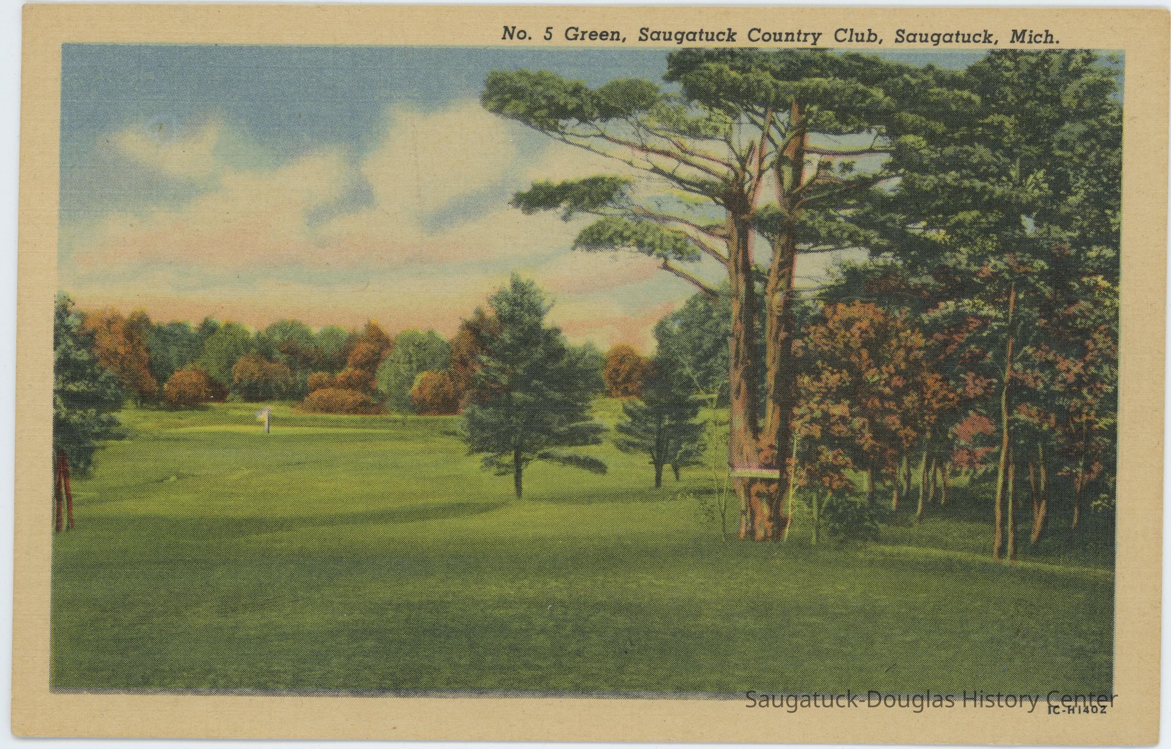 A color postcard showing the view from the fifth hole at the Saugatuck Country Club. The white flag of the hole is on the center left. Surrounding the green are the woods.
