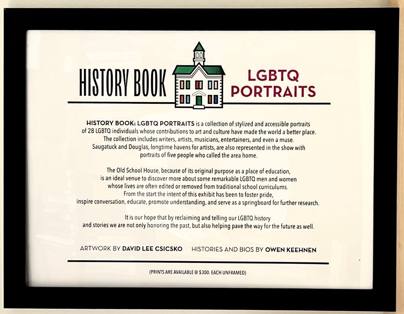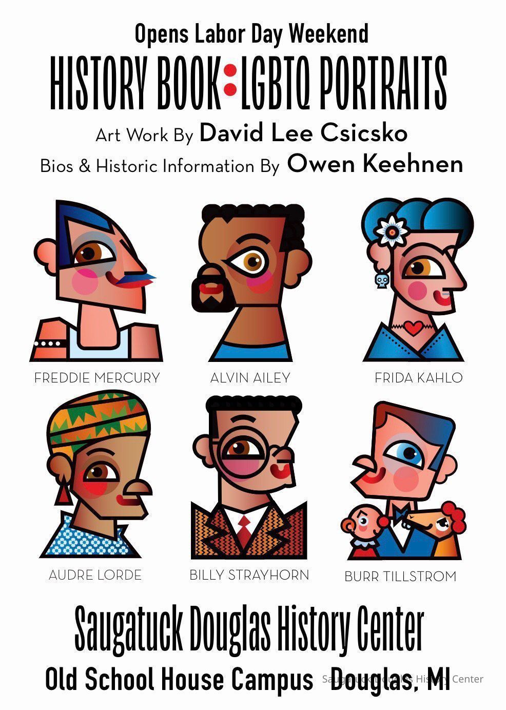 In conjunction with the exhibit "A Century of Progress," the History Book exhibit featured more than two dozen stylized portraits of local, national and international LGBTQ pioneers by Chicago artist and designer David Lee Csicsko. Biographical and historical information for the exhibit was developed by LGBTQ historian and author Owen Keehnen. Both Csicsko and Keehnen are inductees of Chicago’s LGBT Hall of Fame and the illustrator and author of the book "LGBTQ+ Icons: A Celebration of Historical LGBTQ+ Icons in the Arts."