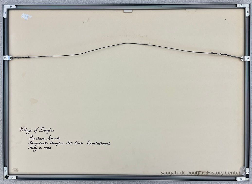 The painting is behind glass with a white mat and .25 gray-metal frame. A brass plaque attached to the glass reads "Bonevich Village of Douglas 1988"