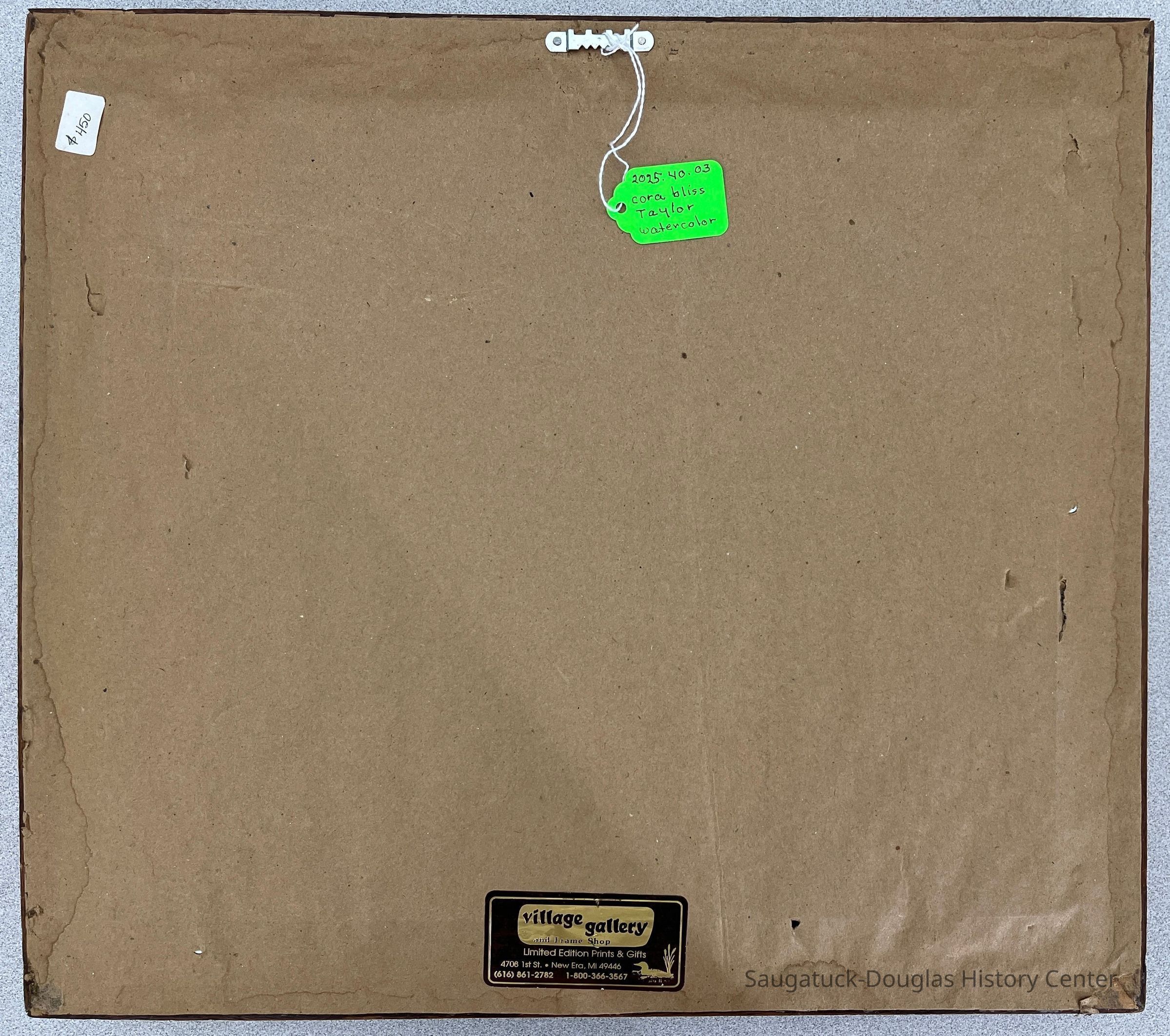 The artwork is behind glass with a beige mat and a brown wood frame. On the back of the frame is a label marked "$450" and "Village Gallery and Frame Shop" in New Era, Michigan