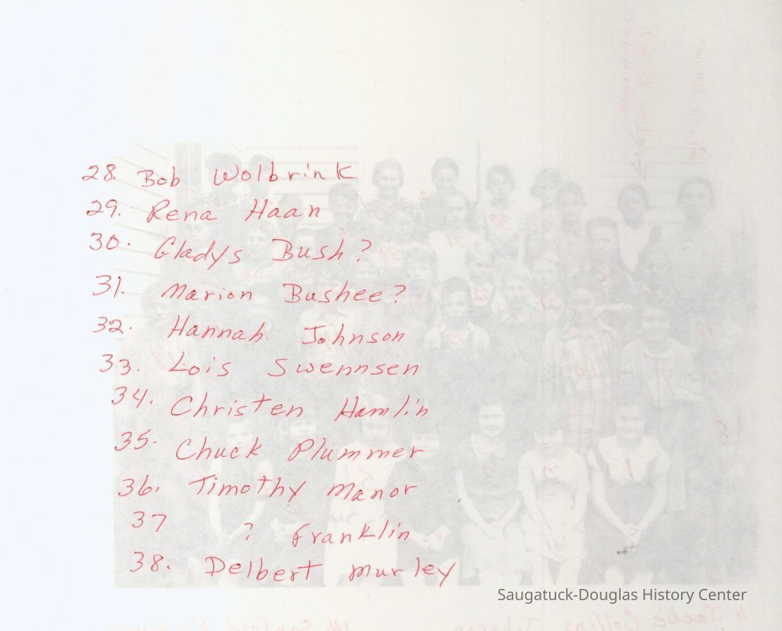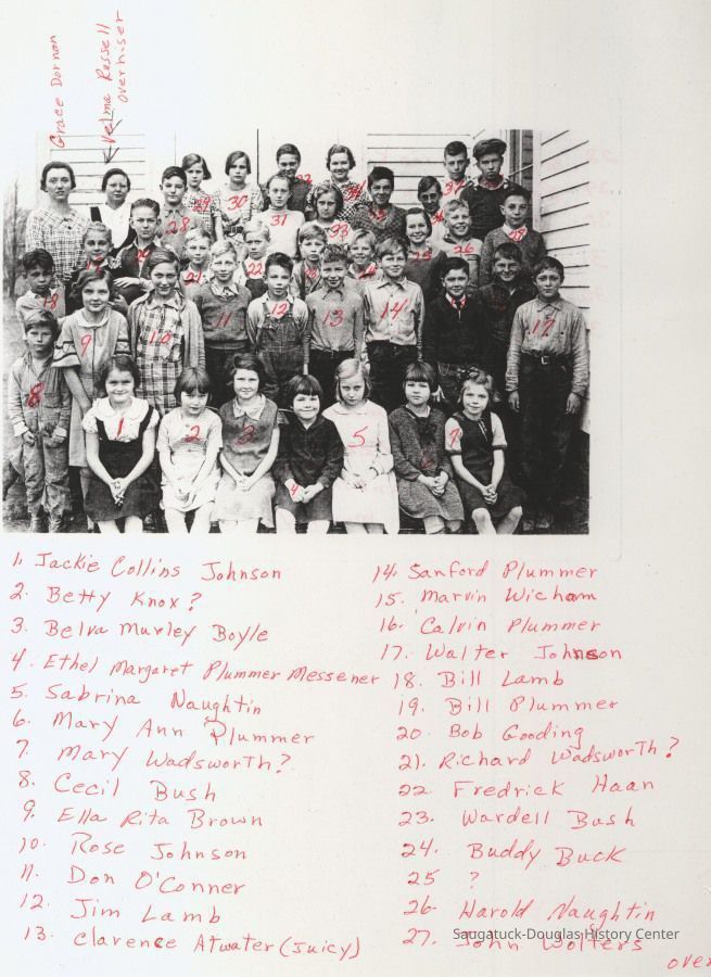 HISTORY OF GANGES SCHOOL DISTRICT #6 This Ganges School was built on land just north of the Ganges Corners, or Johnson's Corners as it was then called. The Allegan County Land transfer was dated October 15, 1814, from Wm. H. Sutherland, founder of Pier Cove. This land transfer was recorded March 7, 1816, and the building was probably built at that time. The Ganges School Association minutes states "The school ground was purchased in 1871 from Dennis Sutherland for the sum of One Hundred Fifty Dollars ($150.00), and consists of two acres. The school house was built in 1871 by Weed and Durham at a cost of Two Thousand Four Hundred and Thirty Dollars, ($2,430.00). The building committee was Richard Mack, Lyle Howard and James R. Gardner. James Goodeve also was the first director of the school". There Is good evidence that this school was previously located in the Lakeshore village of Pier Cove. An early accounting of Pier Cove written by H. N. Hutchins states, "Mr. Goodrich and his sister attended school there in 1852". The Allegan County Plat book of 1873 shows a Pier Cove plat and business directory. A school is located on the plat approximately 1000 feet South of the Bridge on what is now 70th Street. It may be that part of the Pier Cove School was moved or dismantled but a new two story school was built at the Ganges location. Early records of the pupils or teachers are not known to exist. Available, however, are the minutes and bylaws of the Union School Association of Ganges, Michigan. The first meeting was held April 5th, 1923. The Constitution under Article four states, "No person shall be eligible to membership or office unless fifty years or more of age, and who has been either teacher or scholar in the Union School of Ganges, Michigan." The first meeting was held at the home of Mrs. Minnie Johnson, who was elected President, Mrs. Zelda Trowbridge, Secretary, and Mrs. Etta Knox, Treasurer. Other members present were Henry Ensfield and wife, Wm. Gardner, Gordon Spencer, Eddie Atwater, Nettie Atwater, Onrita Perottet, Frank Weed, and others. The association had two social meetings each years the summer meeting at the Allegan County Park and the winter meeting usually at the hall above Haile's Garage, or in the H1. E. Church next door. The social meetings were well attended, usually fifty to sixty five in attendance At the 1938 picnic Mr. Charles McNitt was in attendance who was a teacher in the "upper room" in 1893. The minutes were brief and to the point; "A good time was had by a11, Picnic dinner, harmless gossip and old-time reminiscences were the order of the day", Lloyd Goodrich, Secretary. Some of the early teachers were the McVea sisters, Rachel and Esther, Emily Benson Francis Sheehan, Alice Wightman, Helen Kitchen, Marie Schultz, Grace Dornan, and Marie Parrish. In 1951, the Ganges School District voted to raze the old two story wooden structure and build a more modern structure. The District then voted on October 19, 1960, to annex to the Fennville School District, thus ending the Ganges School , District #6 after an existence of nearly one hundred years. --- This history of Ganges School District # 6 was written by former student Robert B. Wolbrink. After the Ganges district annexed to Fennville the building in Ganges was used for another 20 years by special programs before being sold in the 1990s to the Ganges United Methodist Church next door. Graduation and other special programs had often been held in the church building and the two structures shared a driveway. Source: SDHS newsletter pg. 254-255