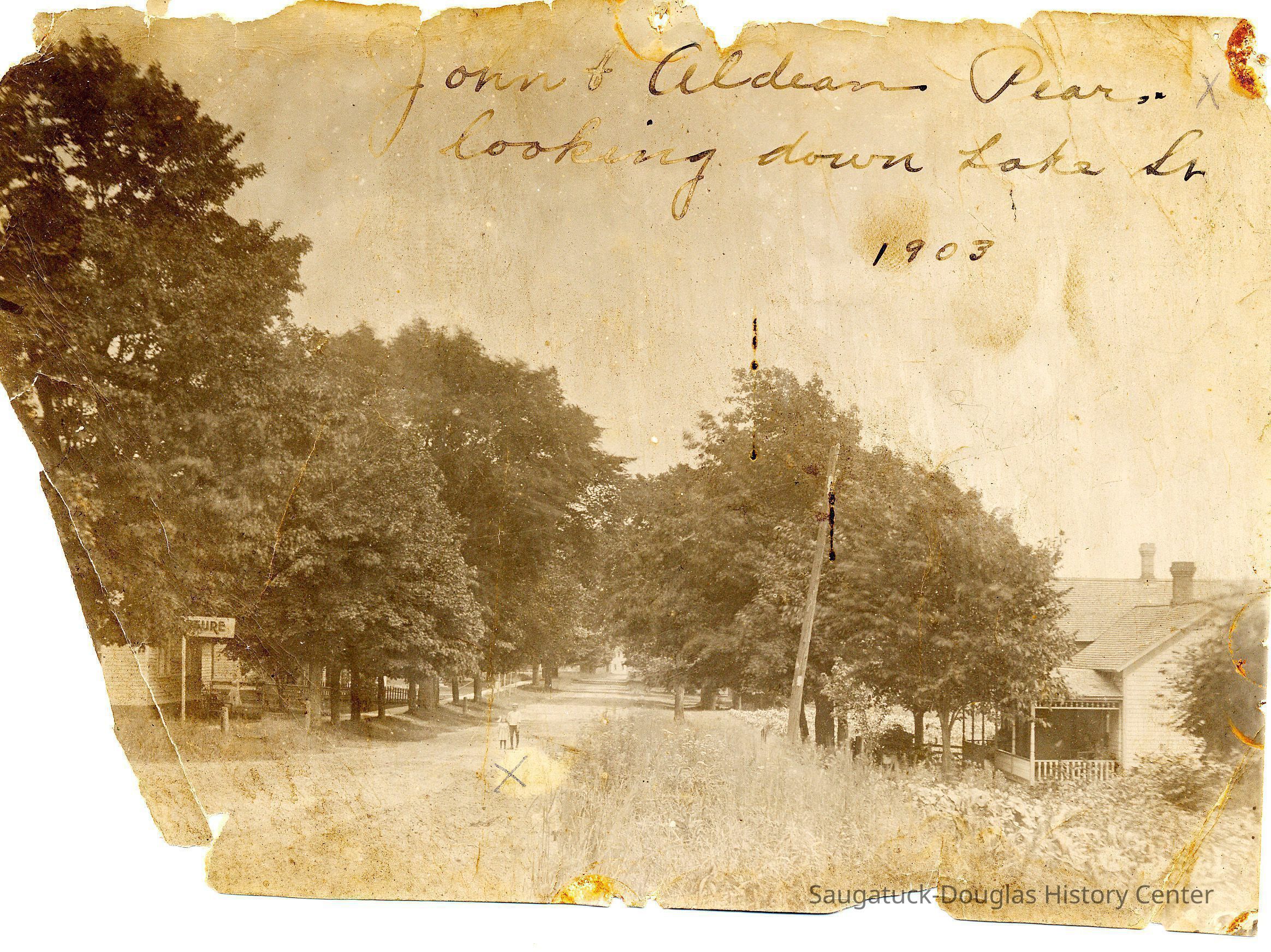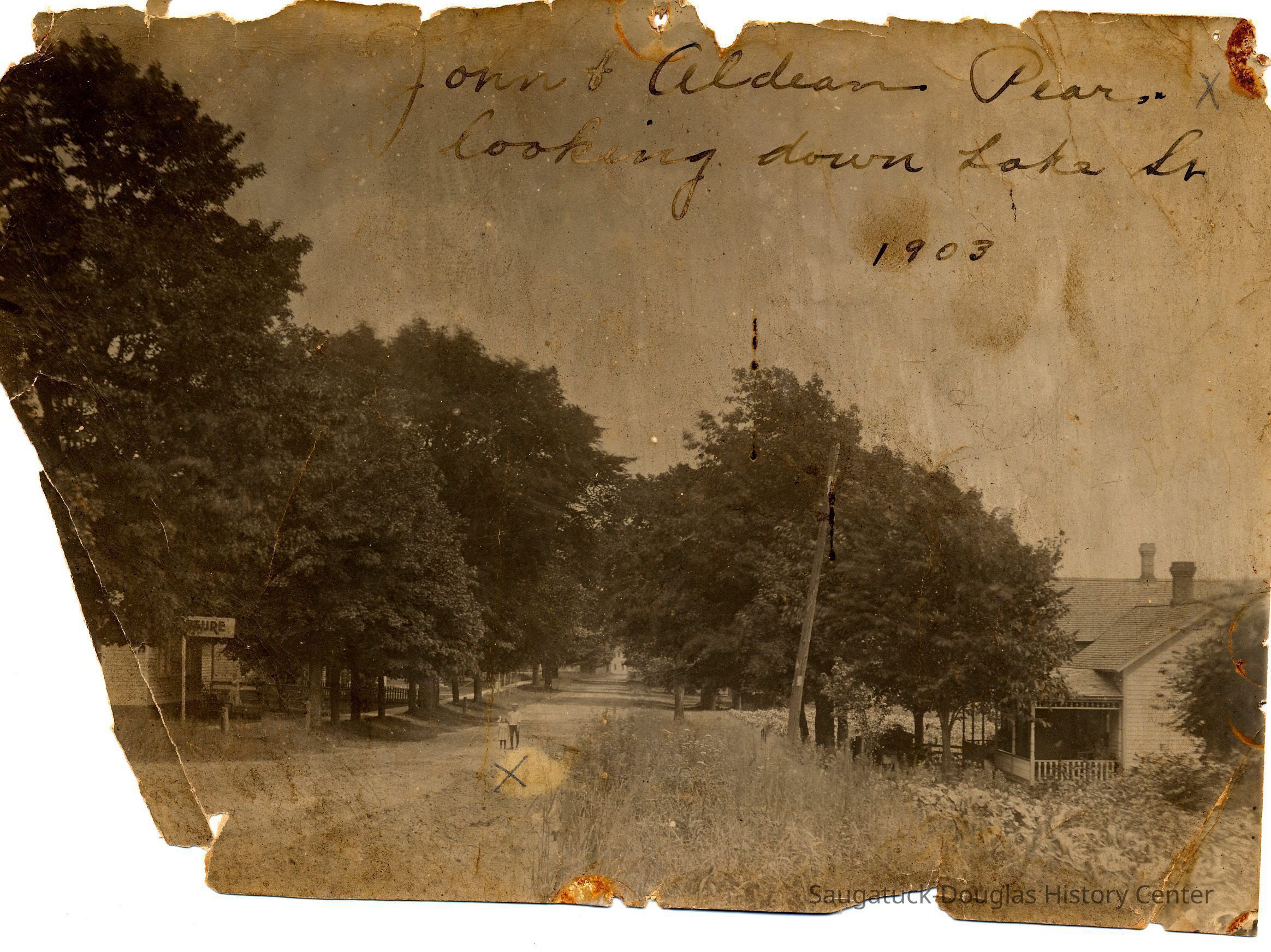 Two small children stand on what may be the stretch of Lake Street as seen from the base of the Allegan St. hill southeast toward State Street. The sign on the left "...URE" may be the Dykstra funeral home building.