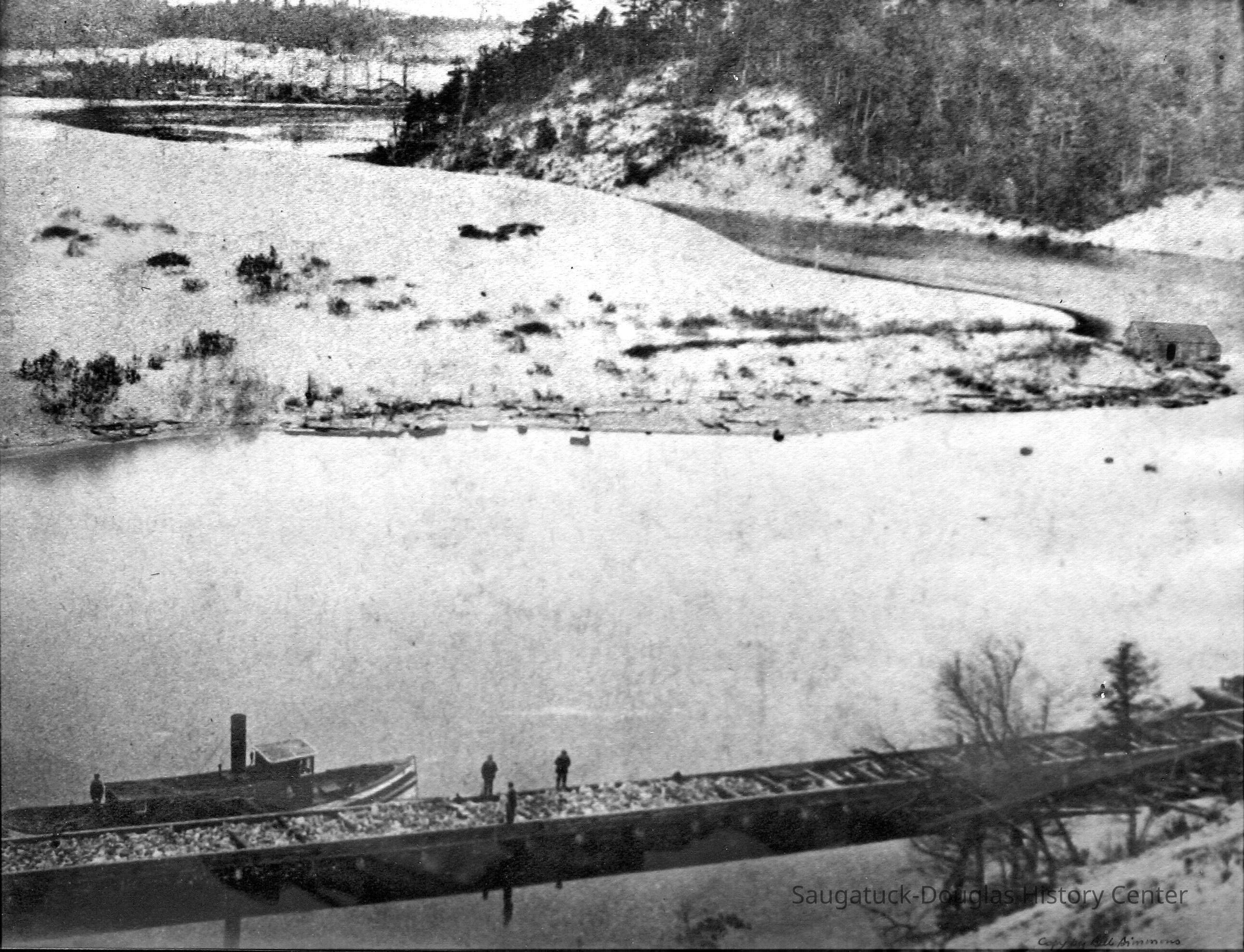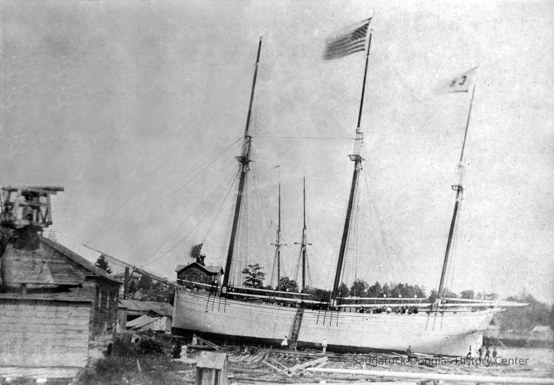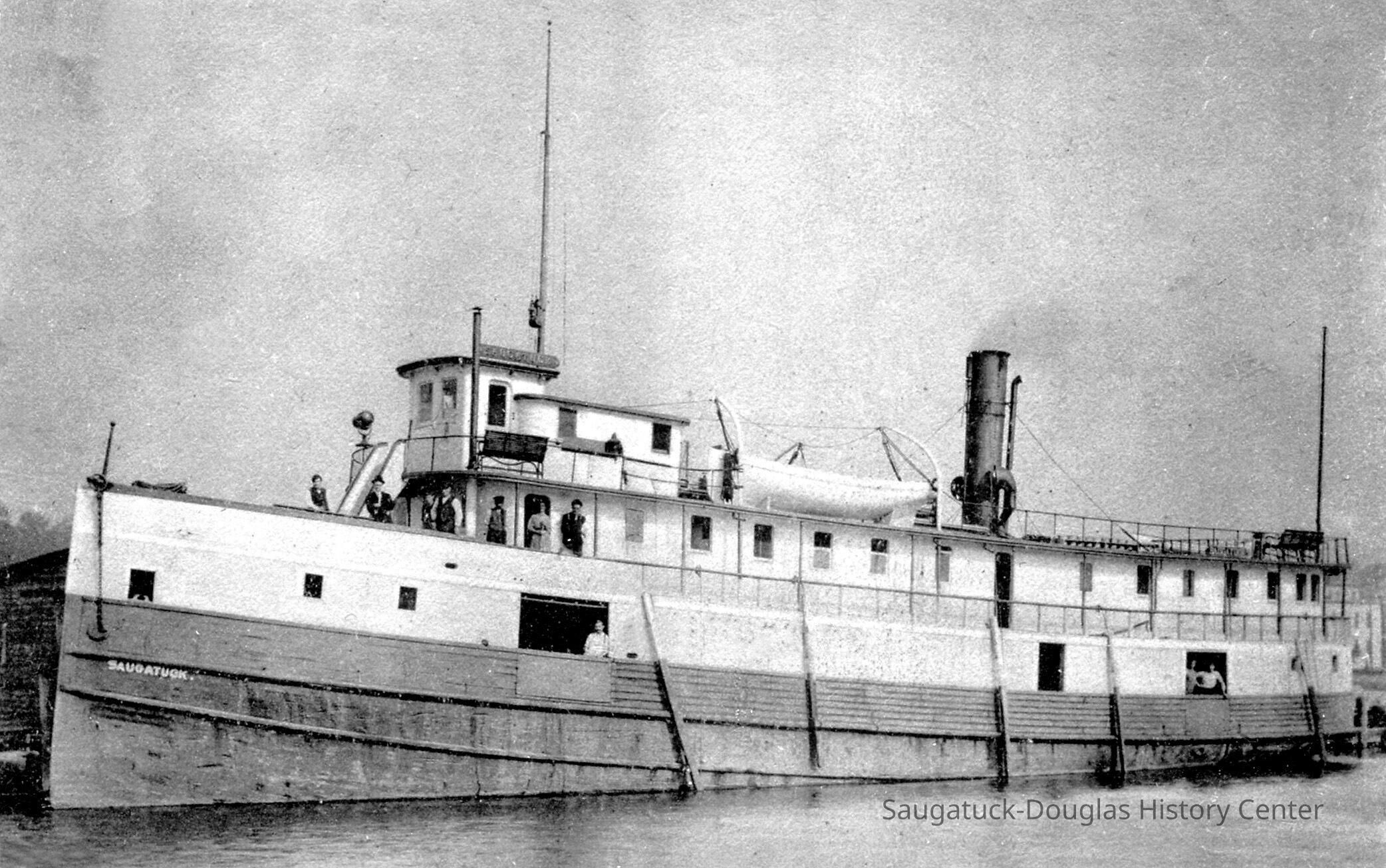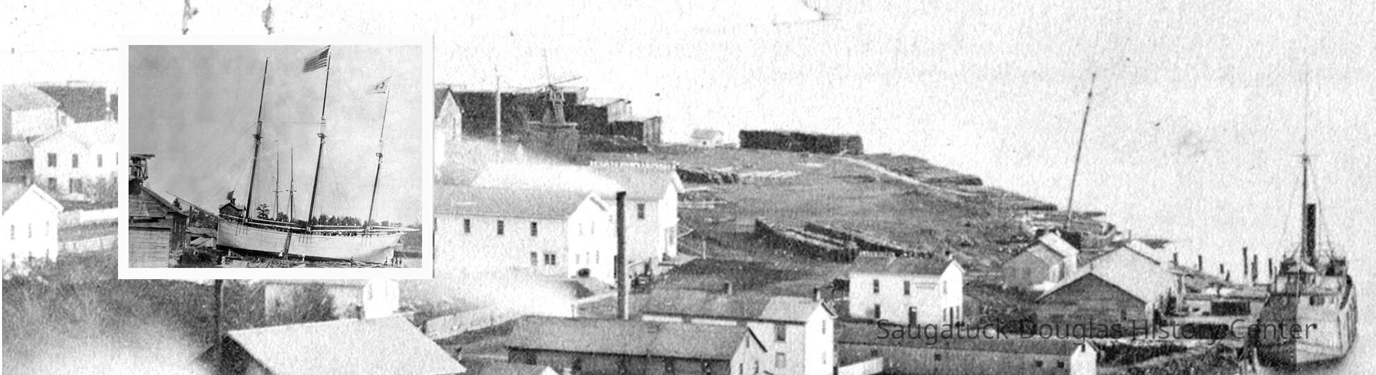 JOHN BAPTISTE MARTEL Saugatuck’s most prolific and best known “old time” builder of boats. Many photos of his boats have survived but unfortunately not a single photo of Mr. Martel is to be found. He has been described as small and wiry with slightly hunched bearing. I imagine him as a descendant of a tough French Canadian voyageur. He was born in lower Canada about 1834, and apprenticed as a lad in Lake Erie boatyards in the Buffalo, New York area. After the Civil War the country was moving west and Lake Michigan shipping was in the midst of a boom. Martel came to Saugatuck about 1872, looking to start a boat yard on the east shore of Lake Michigan. Stephen Morrison’s tannery waterfront property between Griffith and Mason Streets was a prime location and available. In later years, he moved the yard a block north to the area fronted by Water and Mason Streets. Martel built some fifty boats in his long career in this area. He was a true builder, not a financier-builder and not an owner-operator like many of the other men we will chronicle here. His specialty was the tugboat and he built some thirty five. These boats were generally 45 to 70 feet in length, steam powered, sturdy little work-horses that were much in demand in Great Lakes harbors. Chicago was a busy port and many were built for use there. Tugs were mostly used for pushing and pulling but many were used in the commercial fishing trade. At the Kalamazoo River mouth they were especially needed in the spring to pull vessels over the sandbars that had built up during the winter. John Baptiste and his wife Maryon had two children, John and May. They lived on the hill in Saugatuck in a home, purchased from lumberman W. B. Griffin in 1881, located on the corner of Main and Grand Streets. She died in 1899 and he in 1909. By Jack Sheridan