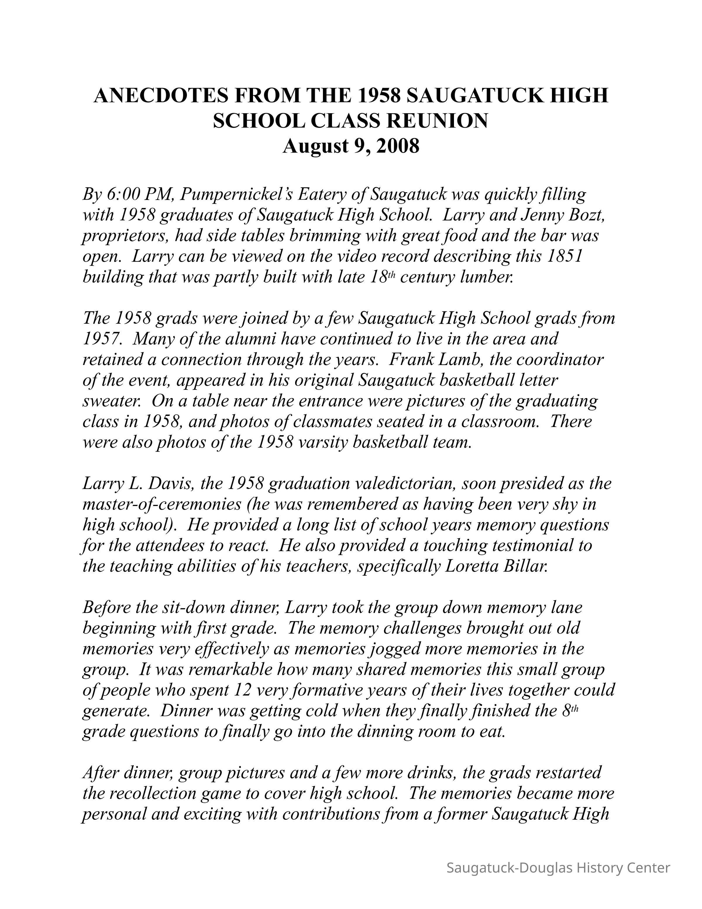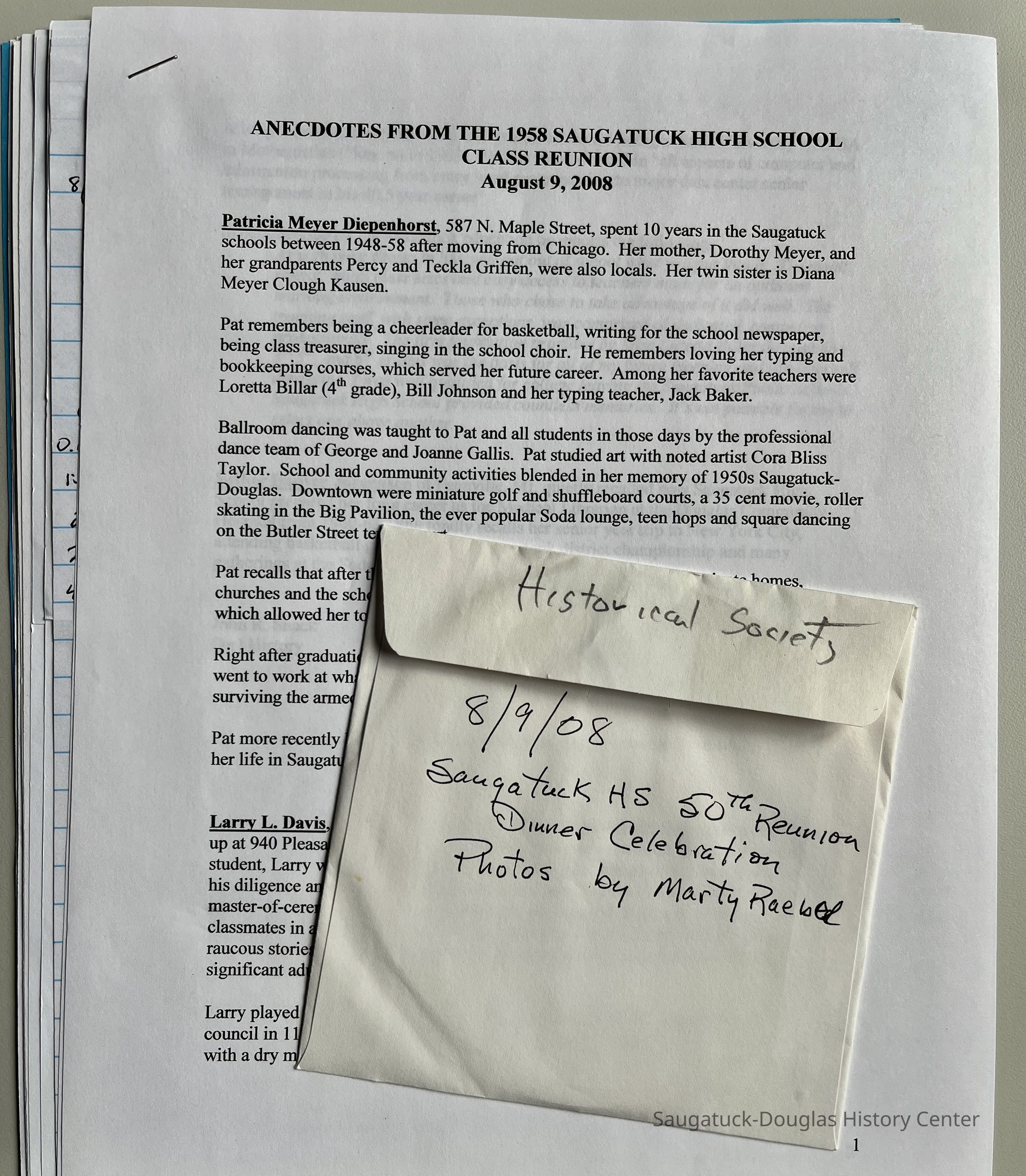 Documents and DVD of photos taken by Mary Raebel at the 1958 Saugatuck High School 50th Class Reunion dinner celebration that occurred on August 9, 2008 at Pumpernickle's Restaurant.