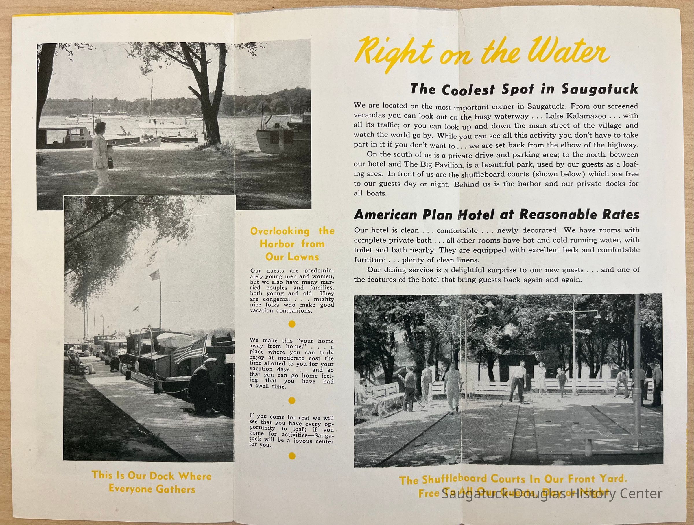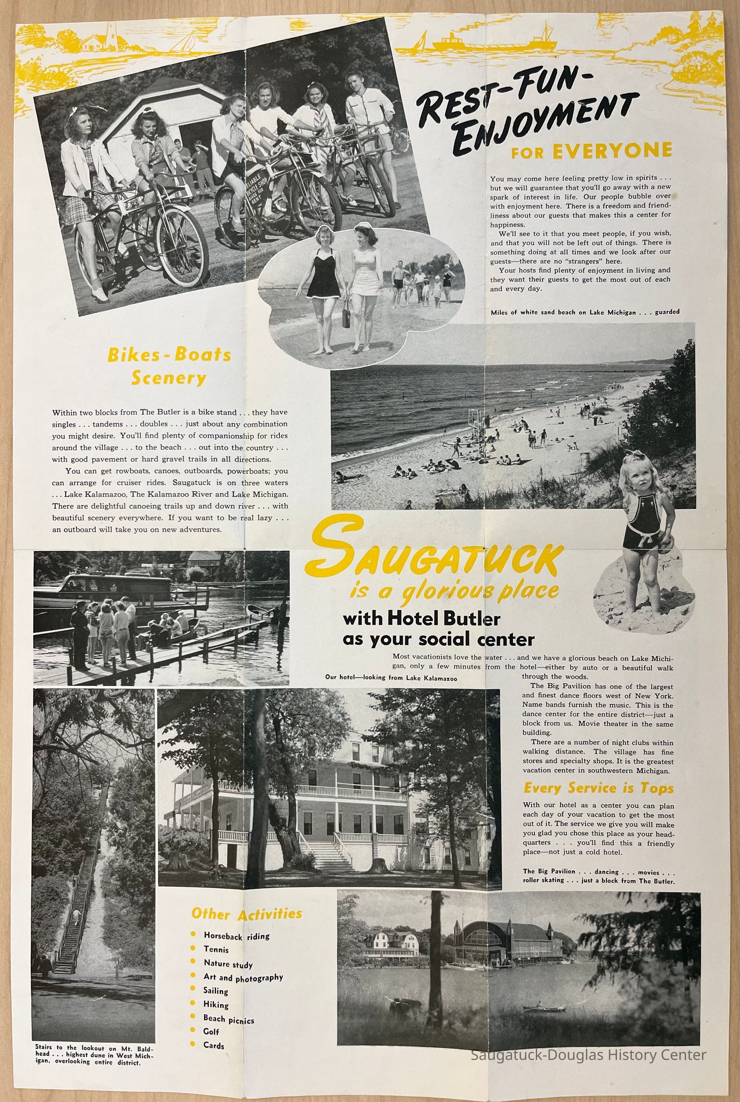 A yellow tri-fold brochure produced by W.J. Kirby, Owner manager of the Hotel Butler advertising Saugatuck as a tourist destination. It includes photos of the Hotel Butler dock, shuffle board court, Oval Beach, Big Pavilion, Mt Baldhead steps and young people on bicycles rented from Reliable Bicycle Shop.