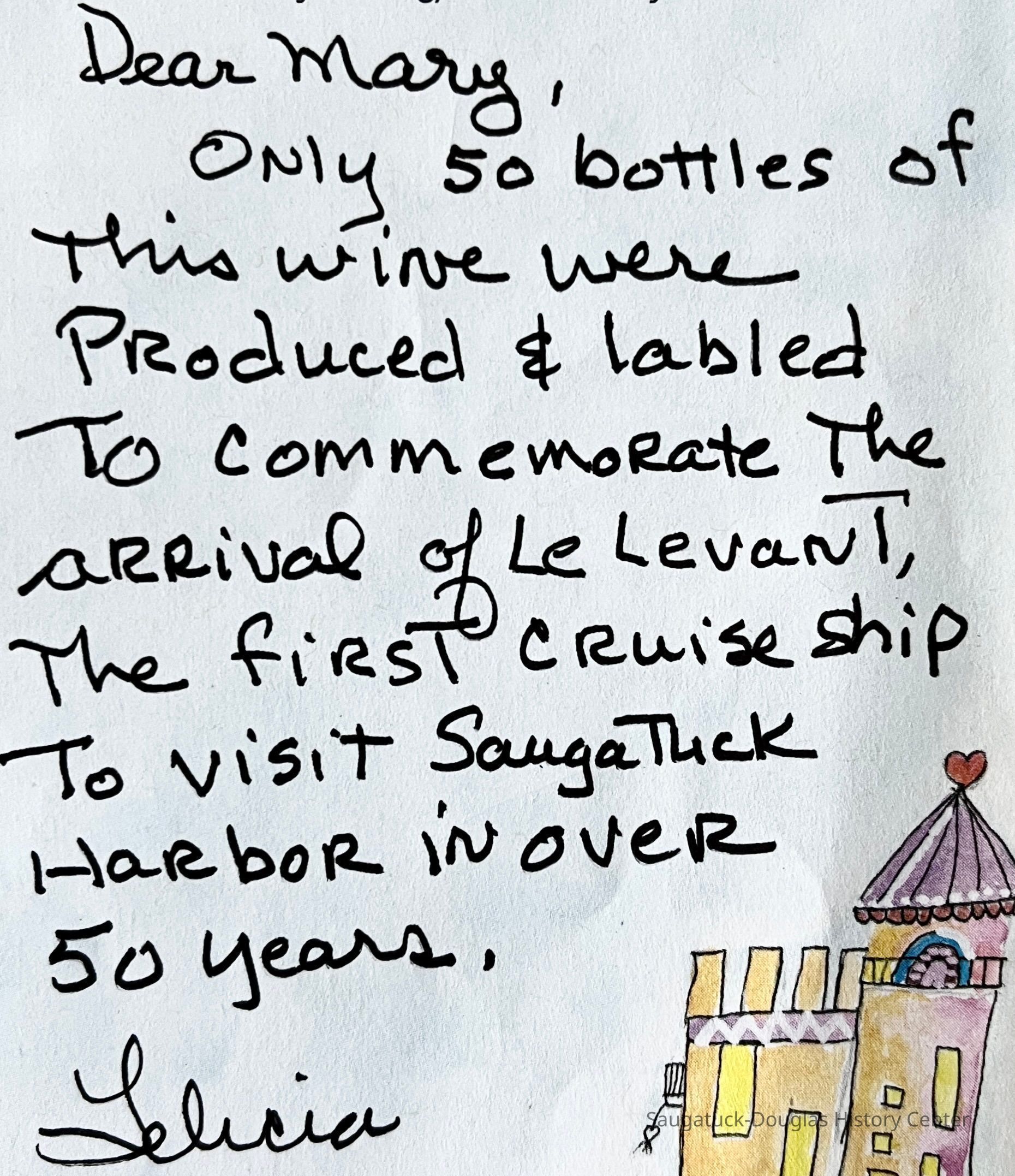 Le Levant, a dark blue cruise ship briefly revived the great lakes tradition of passenger ships docking at Saugatuck to bring visitors to town. Tabor Hill Winery is located in Buchanan, Michigan but had a retail tasting room on Butler Street.