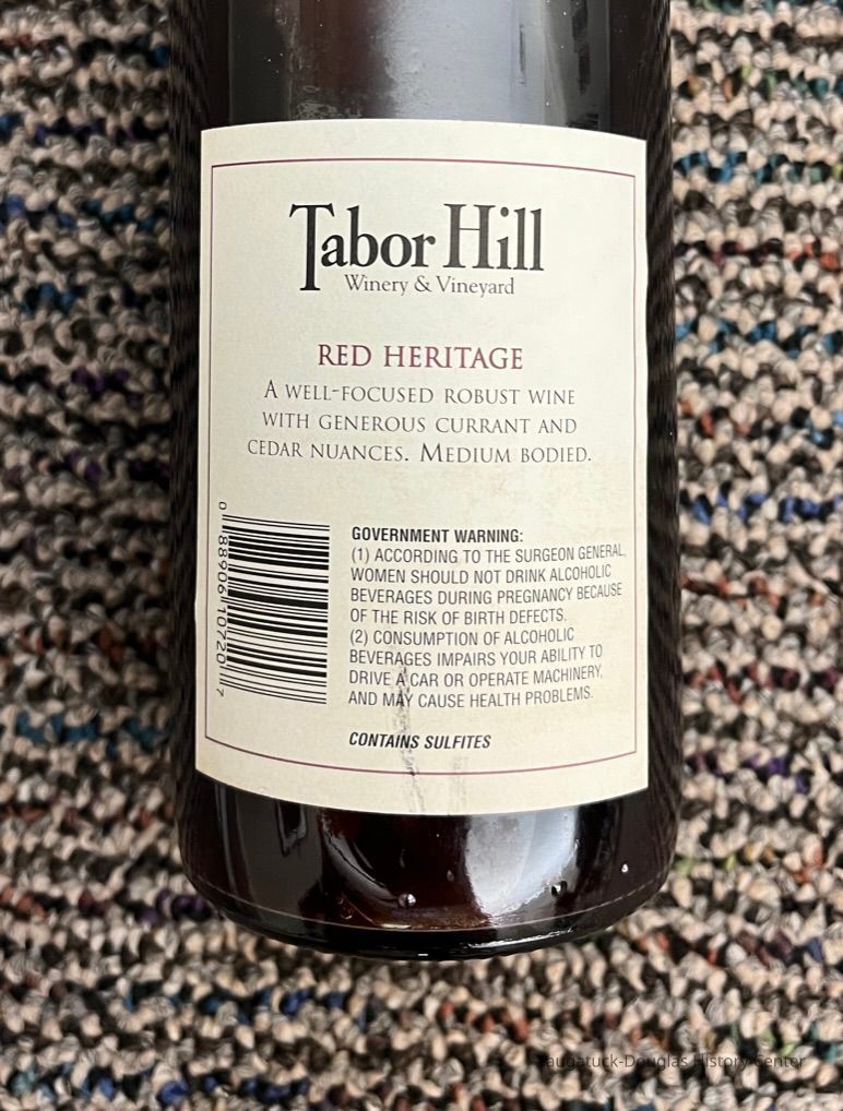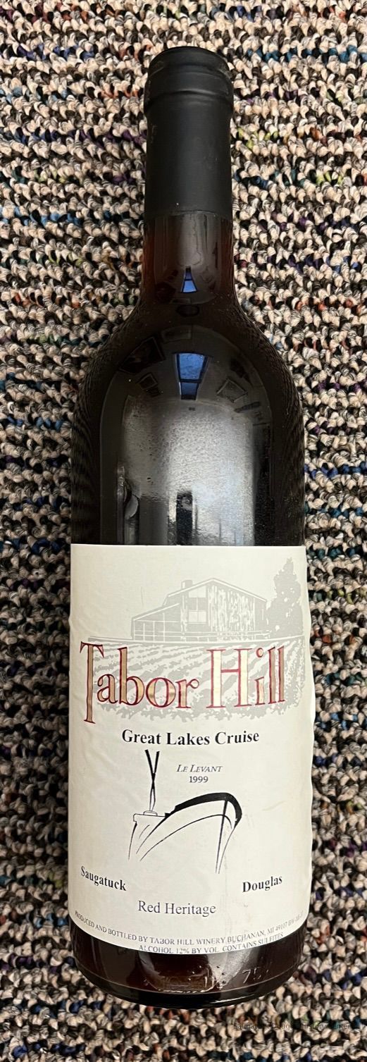 Glass bottle of "Great Lakes Cruise" red wine from the Tabor Hill winery with special-edition label commemorating the passenger ship Le Levant 1999. The bottle contains wine.
