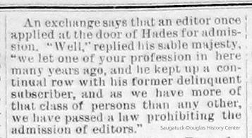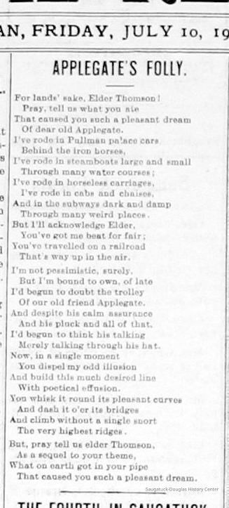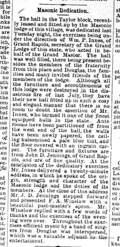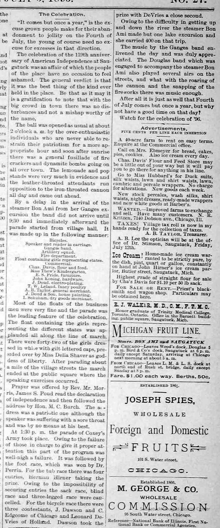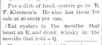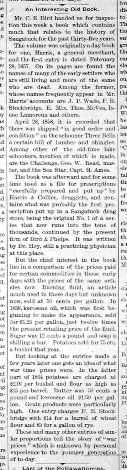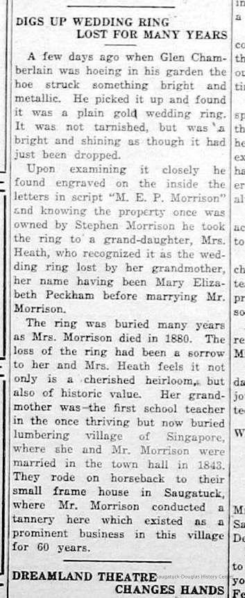 Morrison, Stephen A. Jr. 1815-1905Newton, C.M. or C.W.Woodall, Lena Mrs.Kleeman, Reinhold F. 1838-1894 or 1890Masonic Lodge #328 F. & A.M. SaugatuckNies, Jan "John" 1836-1920Parking Lot Butler Pantry/Wilkins Hardware/D.L. Barber & Co./Taylor & Barber Co.Bird, Charles Edmund “Carl” Jr. 1879-1968Collier, Thomas c1841-1871Hoy, Dr. William Tarlton 1818-1900Davis, James F.J.S. Crouse (ship) 1898Hancock, Phillip Henry 1849-1913Arnold, George Thomas 1846-1921Rogers, Reuben Turner 1840-1926Abbott, Charles Henry 1827-1899Stone, George R. 1838-1919Coates, Amariah H. Capt. 1836-1878Wilson, Issac 1827-1904Bryan, Willis Simon 1888-1972John A. Aliber (boat) 1897-c1927Priest, John 1836-1922Sailor, John Jr. 1868-1939Thomson, Alexander 1844-1914Morrison, Mary Elizabeth (Peckham) 1816-1881Williams, JackSewers, Florence B. 1893-1984Bale, Florence Isabell (Dutcher) 1884-1957Crow, Dale John 1899-1935Hungerford, George Boone 1916-1980Biller, Loretta M. 1913-2008Gleason, Henry 1925-2019Simmons, William "Bill" R. 1890/1-1966Wilson, William J. "Bill" 1915-1992Bekken, Edward "Bud" 1916-1983Crawford, George Robert "Bob" 1913-1999Reiser, Pauline R. (Jones) 1920-2001Thomas, Everard "Ev" D. 1912-2004Mann, Charles "Charlie" W. 1911-2001Kasten, Erwin F. Sr. 1904-1979Weener, Alan Jay "Al" 1951-