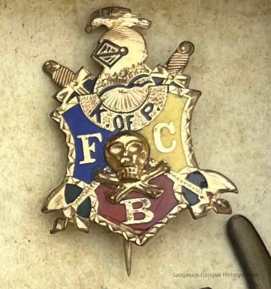 Gold-tone and enamel Knights of Pythias lapel pin in the shape of a coat of arms with a knight's helmet on top of a shield backed with crossed swords/axes and fronted with “K. of P.” and the letters “F”, “C” and “B” that stand for “Friendship”, “Charity” and “Benevolence.” A scull and crossbones, in relief, fills the center of the pin.