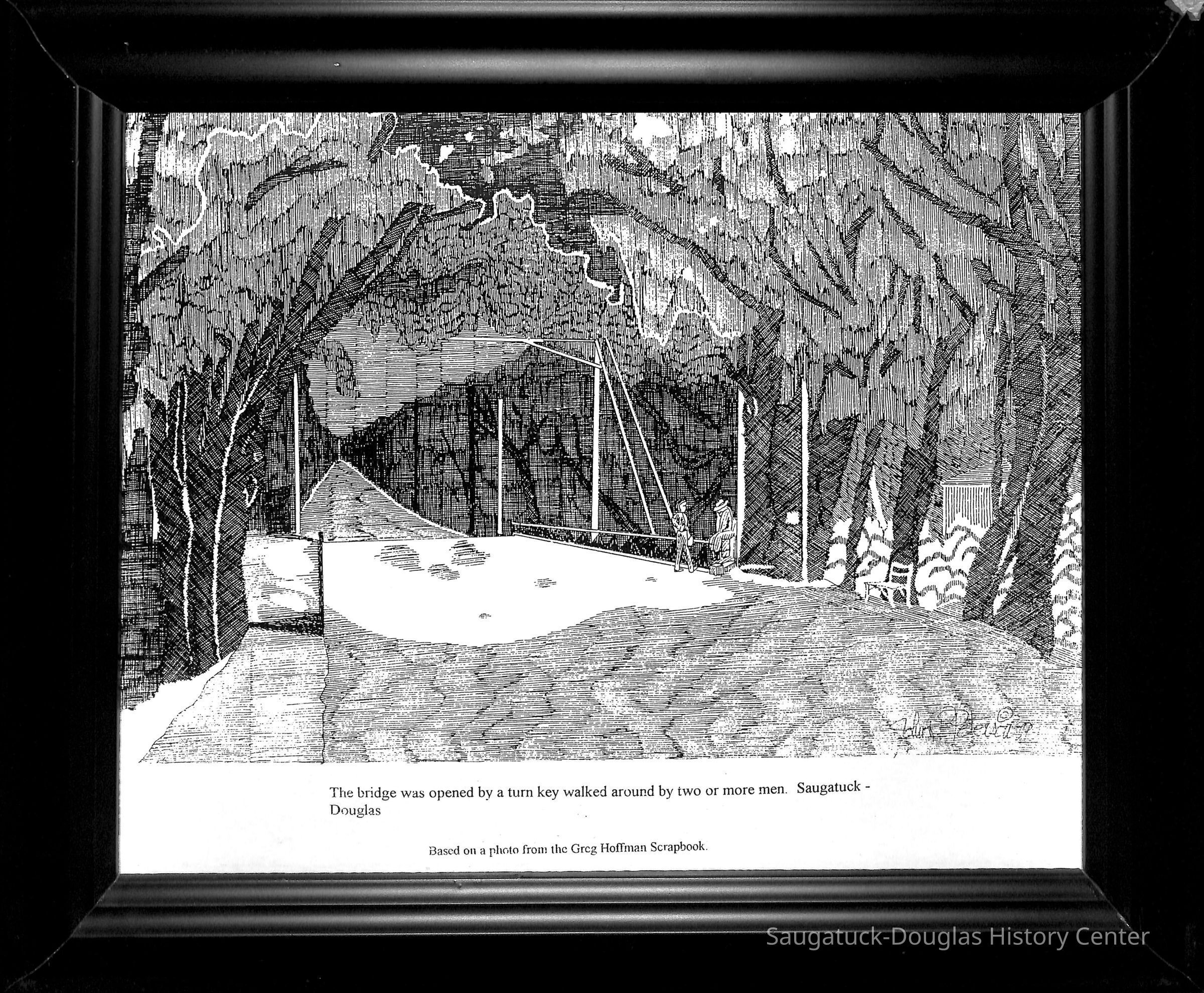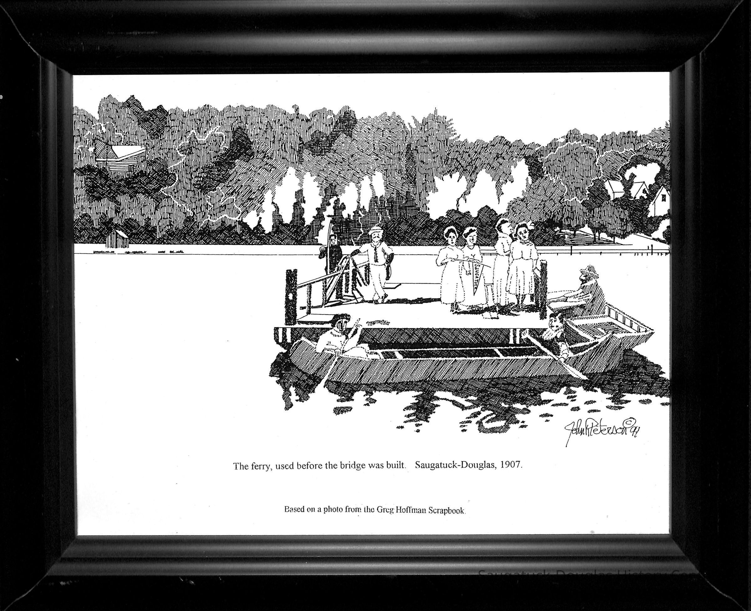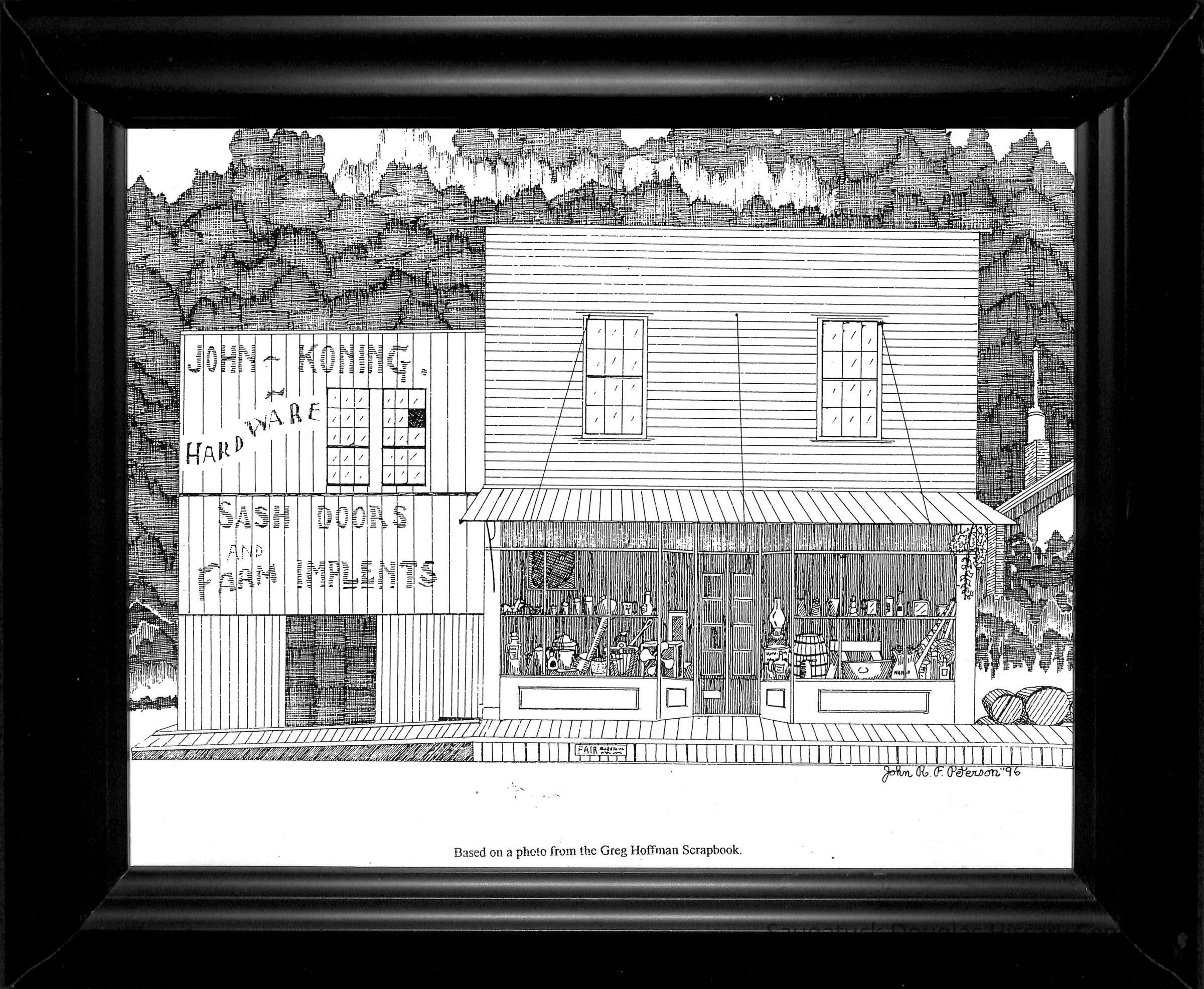 Four prints of pen and ink drawings by John Peterson. These were based on photos from the Greg Hoffman Scrapbook.