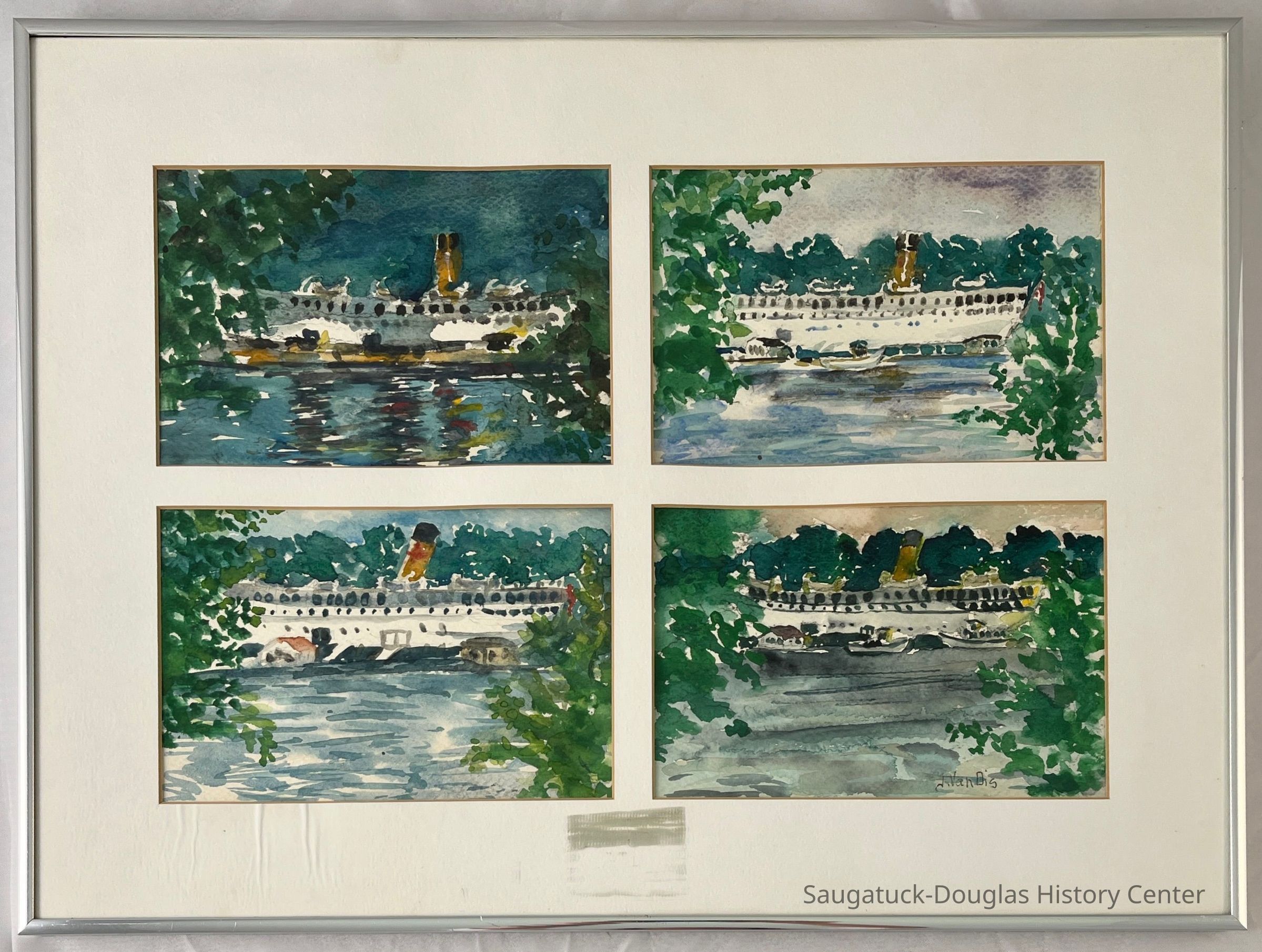 Four individual watercolor paintings of the Keewatin steamship matted together to create a composite artwork. Artworks are behind glass with a .5" silver-tone metal frame and white "windowpane" mat.