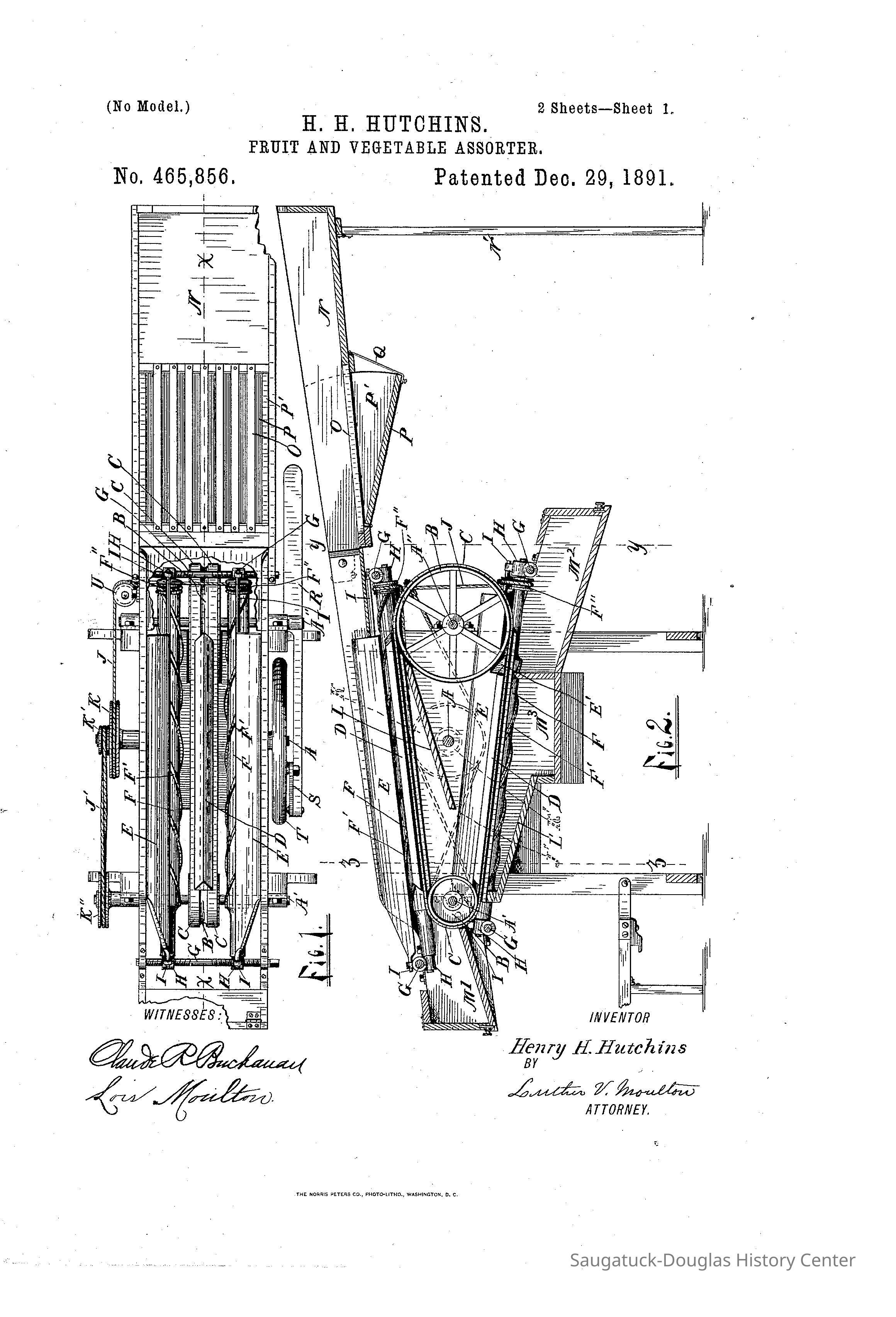 from "Pieces of the Past" 2017 at the OSH An indispensable tool for the fruit-belt farmer. Patented in 1891 by Henry H. Hutchins of nearby Ganges, Michigan, the Hutchins Fruit and Vegetable Assorter used gravity to remove stems, leaves and other debris from just-picked produce and then quickly and accurately sort the items by size for efficient packing. According to satisfied customer J. R. Goodrich, “I can say regarding your fruit assorter that I assorted during 1891 eight thousand bushels of peaches with it. One man does the work; it turns easily, occupies a small space in the packing house and I have realized no damage to the fruit. It has saved me several times its cost and I can cheerfully recommend it to all fruit growers.” Saugtauck-Douglas has the good fortune of residing within the Michigan Fruit Belt, a slim slice of land along the eastern side of Lake Michigan with late springs, cooler summers, and warmer winters. These lake-effect conditions create a micro-climate good for growing fruit. According to Henry Hutchins, in the late 1850s most fruit was grown for home use. But by the early 1870s, local farmers noticed the thriving fruit industry in St. Joseph, Michigan and followed suit. Soon boxes, baskets and barrels of fruit were being sent to population centers by railcar and steamship.