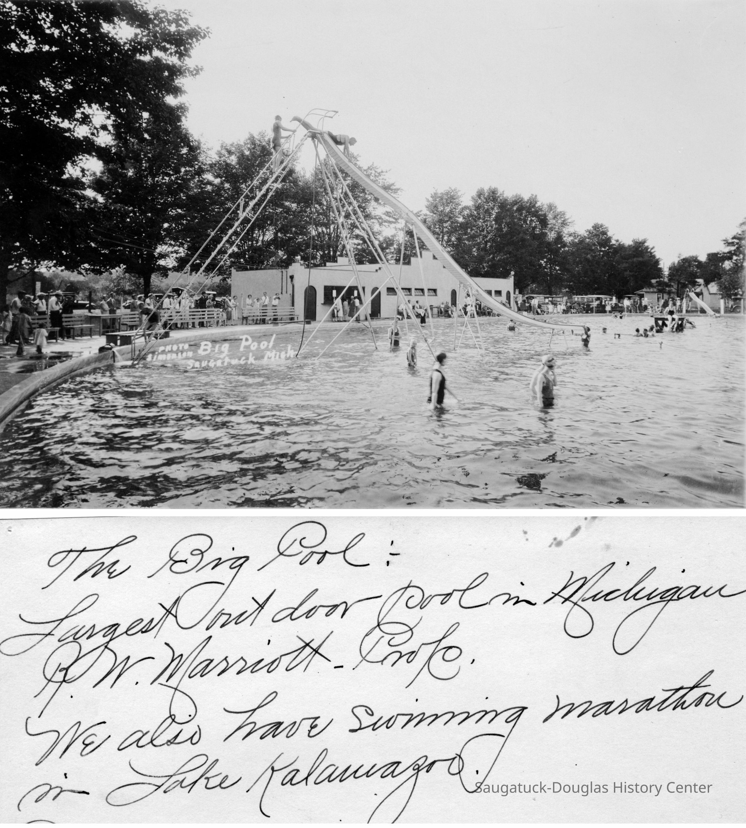 Both photos show bathers in the water and on a tall slide in the center of the pool. The bath house and fence can also be seen.