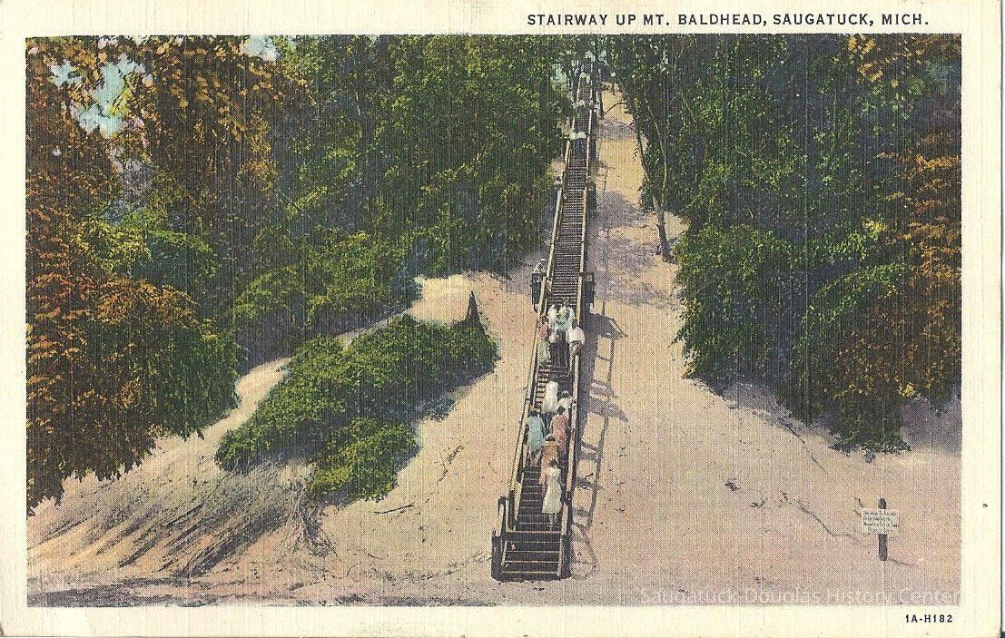 Color postcard with linen finish titled, "Stairway up Mt. Baldhead, Saugatuck, Mich.