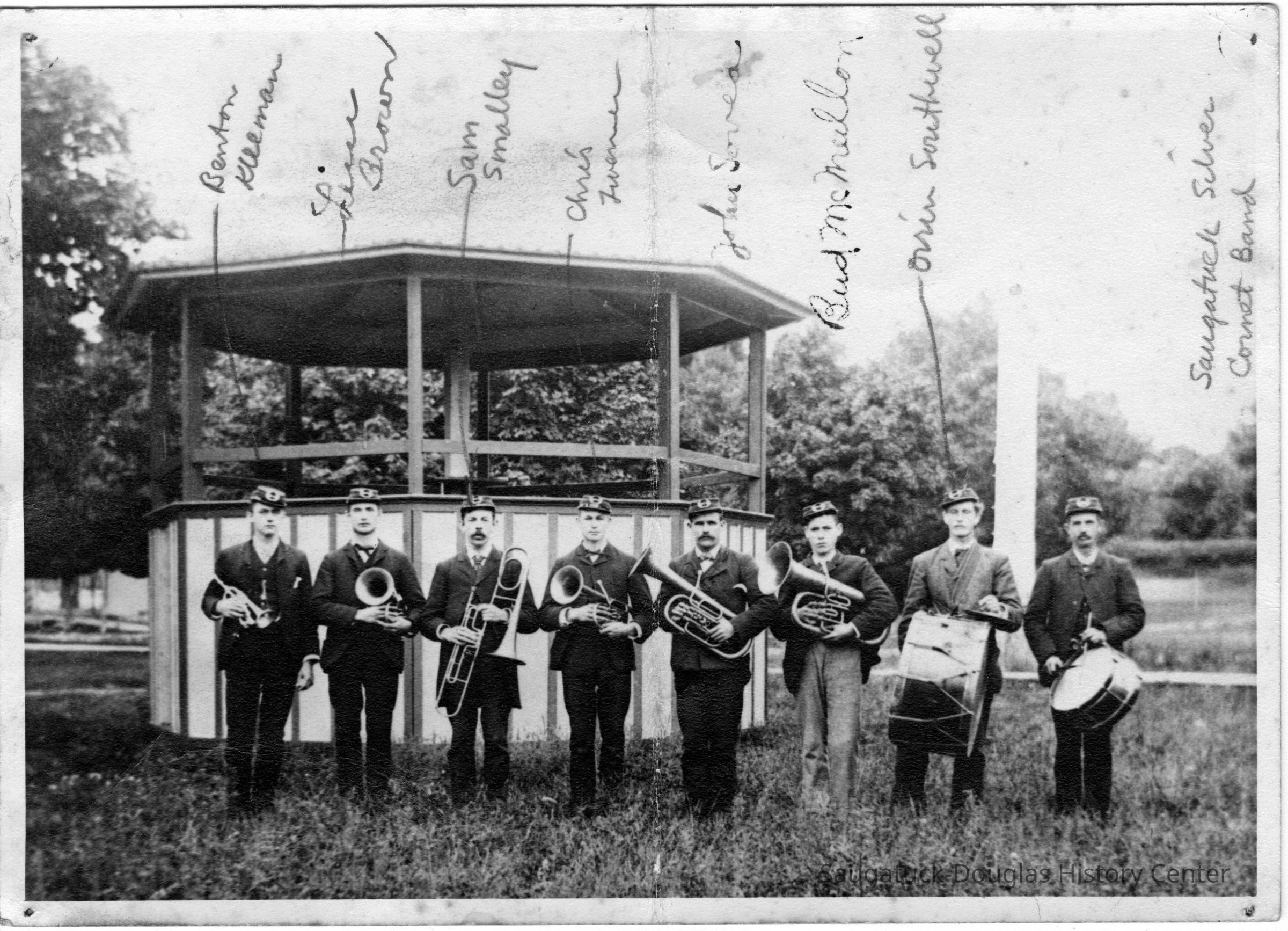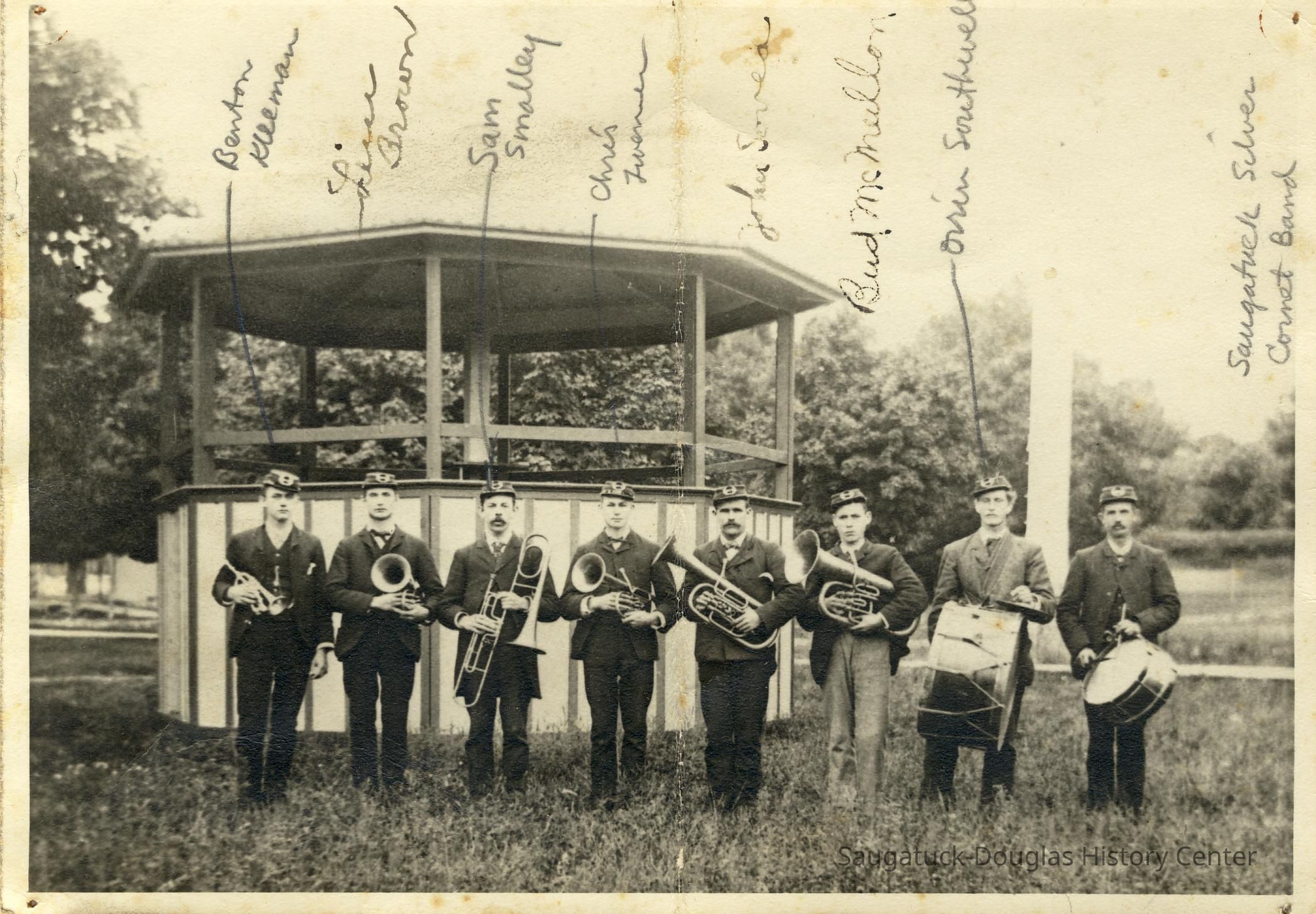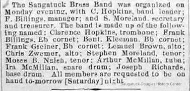 This image was featured as History Mystery #29 with the solution: The band was the Silver Cornet Band and the photo was taken in the Saugatuck village square. Research by James T. Faasen uncovered a 1884 newspaper clipping (below) about the organization of Saugatuck Brass Band that included Chris Zwemer, suggesting the photo was taken between 1884 and December 1886, when Mr. Zwemer committed suicide. Sometimes this image is titled Saugatuck Silver Cornet Band