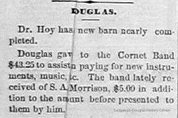 This image was featured as History Mystery #29 with the solution: The band was the Silver Cornet Band and the photo was taken in the Saugatuck village square. Research by James T. Faasen uncovered a 1884 newspaper clipping (below) about the organization of Saugatuck Brass Band that included Chris Zwemer, suggesting the photo was taken between 1884 and December 1886, when Mr. Zwemer committed suicide. Sometimes this image is titled Saugatuck Silver Cornet Band