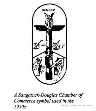 Four color decal given out by the Chamber of Commerce in 1963 to their members. This was displayed in the store windows to show the public that they were members. It depicts a totem-pole with sailboats, dunes, and two men. One an artist and one playing golf