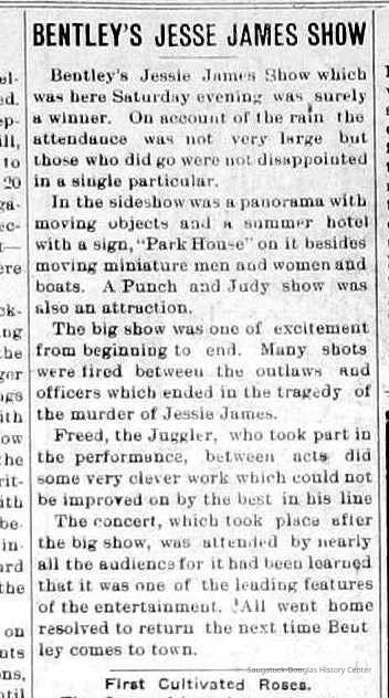 Scans of Commercial Record newspaper clippings about visits or near visits of celebrities, traveling shows, lecturers, strangers, or other people thought noteworthy enough to merit mention in the paper. This is a small sampling of the stories to be found in the paper.