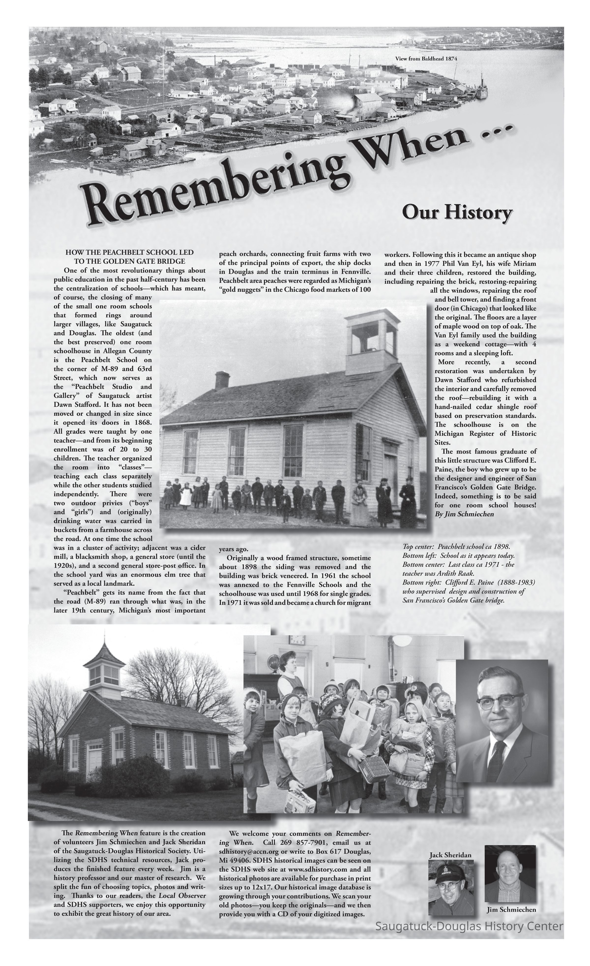 HOW THE PEACHBELT SCHOOL LED TO THE GOLDEN GATE BRIDGE One of the most revolutionary things about public education in the past half-century has been the centralization of schools—which has meant, of course, the closing of many of the small one room schools that formed rings around larger villages, like Saugatuck and Douglas. The oldest (and the best preserved) one room schoolhouse in Allegan County is the Peachbelt School on the corner of M-89 and 63rd Street, which now serves as the “Peachbelt Studio and Gallery” of Saugatuck artist Dawn Stafford. It has not been moved or changed in size since it opened its doors in 1868. All grades were taught by one teacher—and from its beginning enrollment was of 20 to 30 children. The teacher organized the room into “classes”—teaching each class separately while the other students studied independently. There were two outdoor privies (“boys” and “girls”) and (originally) drinking water was carried in buckets from a farmhouse across the road. At one time the school was in a cluster of activity; adjacent was a cider mill, a blacksmith shop, a general store (until the 1920s), and a second general store-post office. In the school yard was an enormous elm tree that served as a local landmark. “Peachbelt” gets its name from the fact that the road (M-89) ran through what was, in the later 19th century, Michigan’s most important peach orchards, connecting fruit farms with two of the principal points of export, the ship docks in Douglas and the train terminus in Fennville. Peachbelt area peaches were regarded as Michigan’s “gold nuggets” in the Chicago food markets of 100 years ago. Originally a wood framed structure, sometime about 1898 the siding was removed and the building was brick veneered. In 1961 the school was annexed to the Fennville Schools and the schoolhouse was used until 1968 for single grades. In 1971 it was sold and became a church for migrant workers. Following this it became an antique shop and then in 1977 Phil Van Eyl, his wife Miriam and their three children, restored the building, including repairing the brick, restoring-repairing all the windows, repairing the roof and bell tower, and finding a front door (in Chicago) that looked like the original. The floors are a layer of maple wood on top of oak. The Van Eyl family used the building as a weekend cottage—with 4 rooms and a sleeping loft. More recently, a second restoration was undertaken by Dawn Stafford who refurbished the interior and carefully removed the roof—rebuilding it with a hand-nailed cedar shingle roof based on preservation standards. The schoolhouse is on the Michigan Register of Historic Sites. The most famous graduate of this little structure was Clifford E. Paine, the boy who grew up to be the designer and engineer of San Francisco’s Golden Gate Bridge. Indeed, something is to be said for one room school houses! By Jim Schmiechen