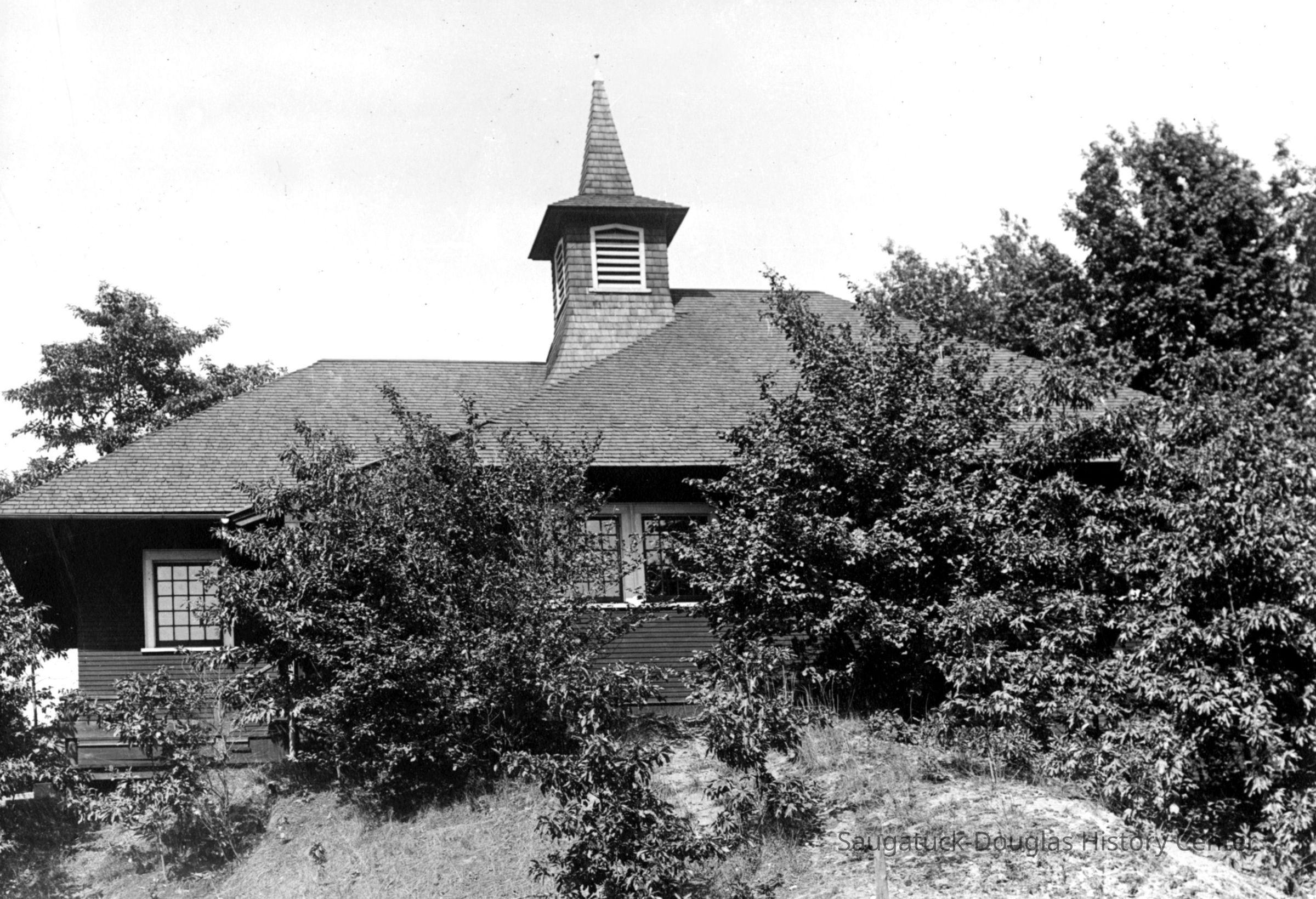 8x10 b/w photo of the Lake Shore Chapel with "Shorewood Chapel Douglas Mich" printed in white in the iamge, as was often done by the Simonson Studio. The photo is mounted on heavy black card. The photo includes the chapel spire and entry wing (south side) as the chapel would look if standing where Lakeshore Drive turns into Campbell Road. The building is obscured by dense shrubbery with few trees blocking out the sky.