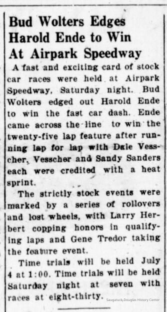 The speedway was about 2 miles South of Douglas on the E. side of US31. It was a 3/8 dirt track with quite a bit of bank. It had Lights for night racing. It was a fast neat race track. Pits were outside the 1st turn. In the 50s they ran 3 classes of cars, Stocks, Modifides and Super Modifides. Some drivers names I recall are Glen Rocky, Jim Murphy, Junior Turpstra, Norm Nelson, Bob DePaw, The Lockwood bros., the Vilwalk bros., Dale Adams, The Covey bros., Ralph Baker, Chuck Grano, Chuck Neal, Gordon Vanderbeak, Butch Gould and lots more.