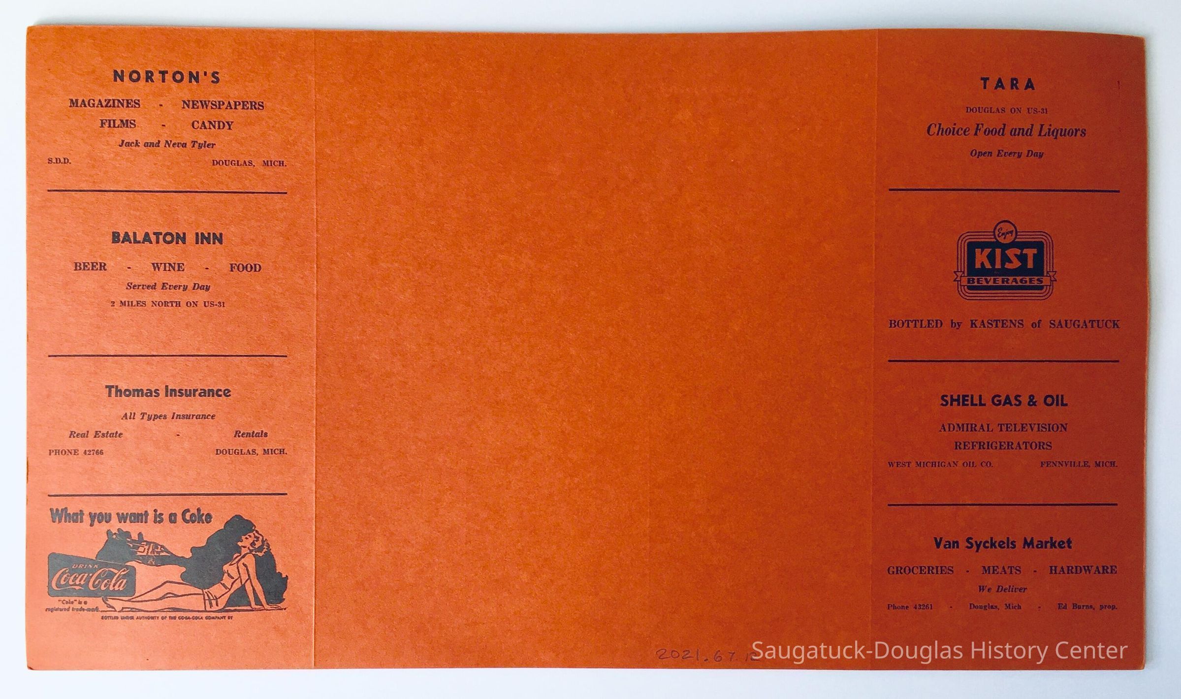 Back of program show the double gate fold and ads for Norton's, Balaton Inn, Thomas Insurance, Coke/Coca-cola, Tara restaurant, Kist (Kastens) beverages, Shell Gas & Oil and Van Syckels Market.