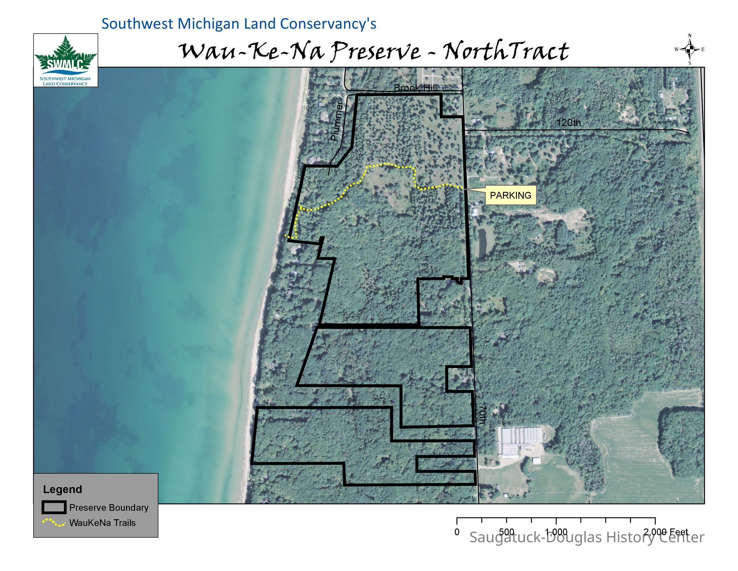 The late William Erby Smith, an early member of the Saugatuck-Douglas Historical Society, developed a lakeshore subdivision which he named Waukena. The following is from a speech delivered by present Society member Jerry Hill at a 2005 Waukena picnic. Mark Smith is Dill's brother. The 130-acre William Erby Smith Preserve is located in Ganges Township