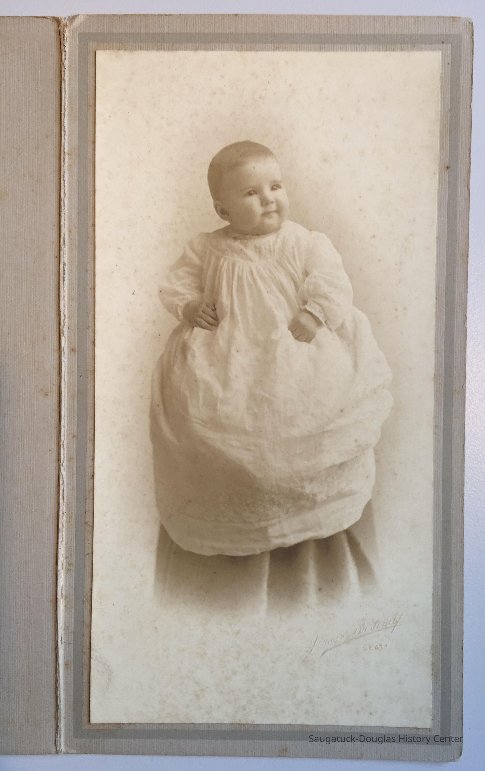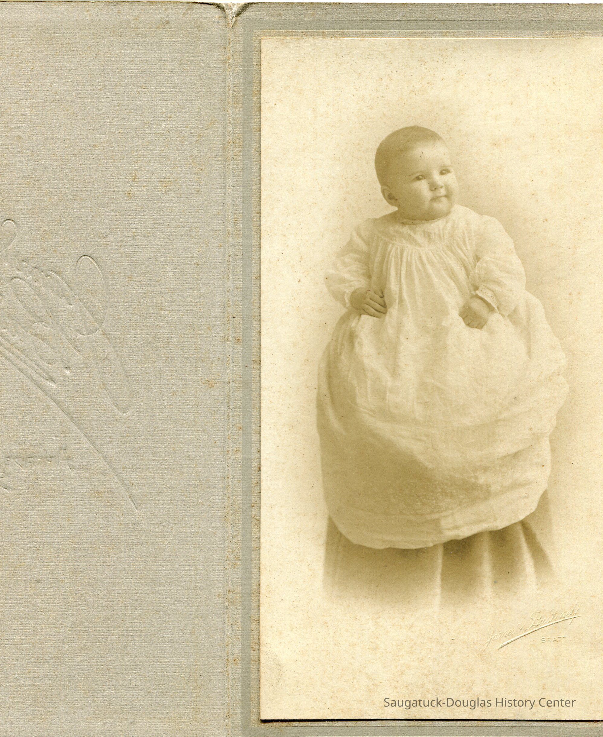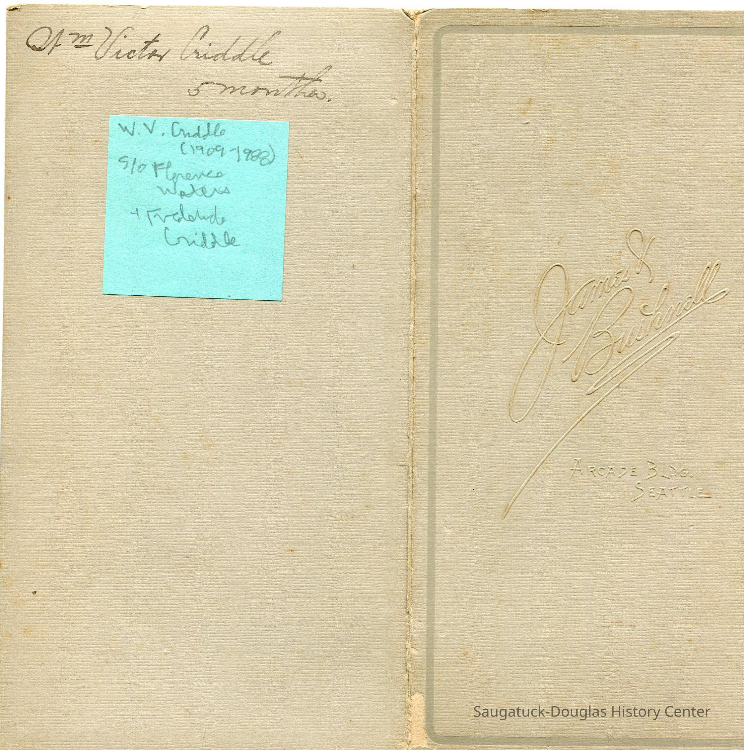 Wm Victor Criddle, 5 months is written in ink pen on the back of the photo folder. A green post-it note offers additional context: W.V. Criddle (1909-1988)