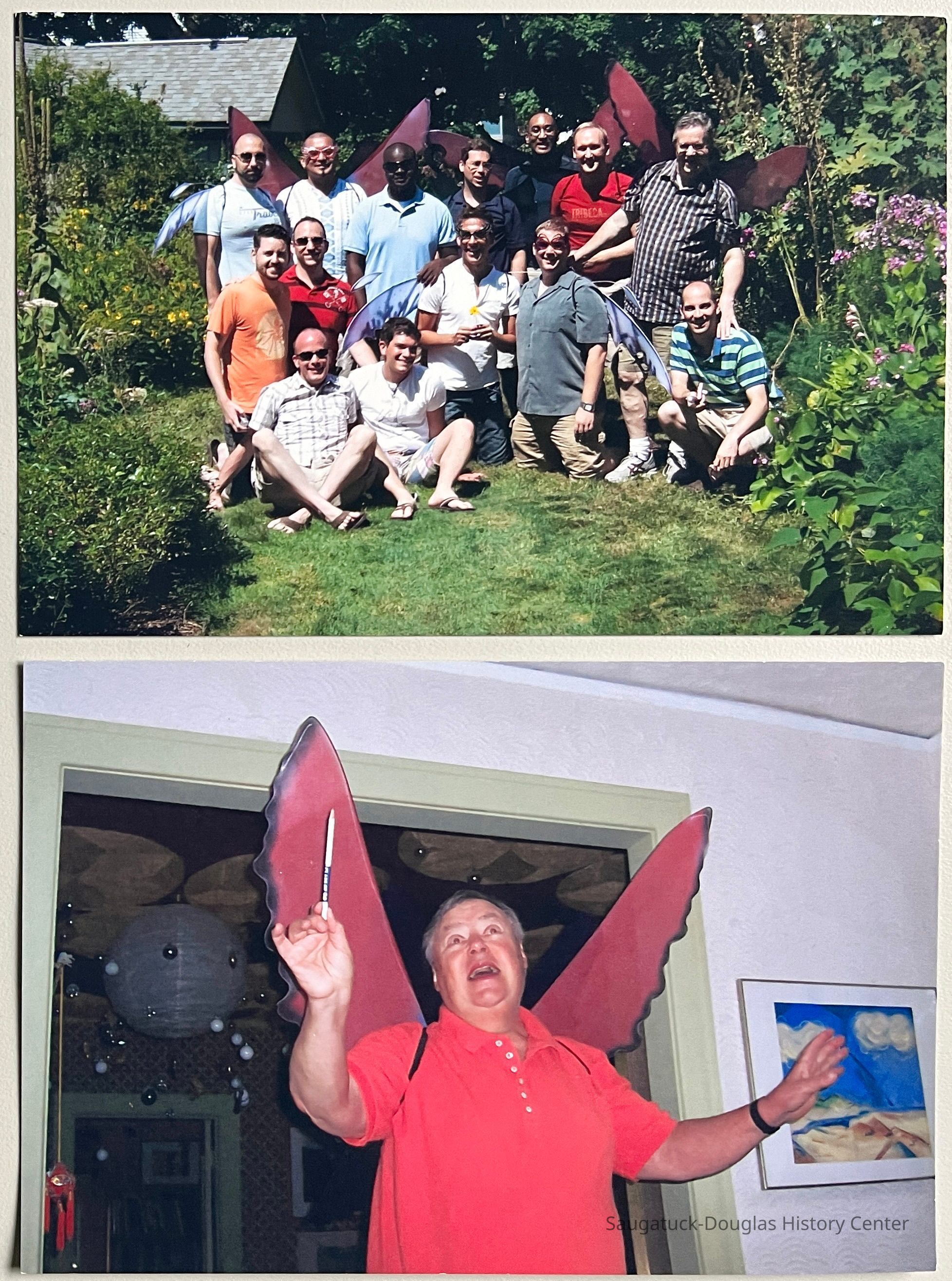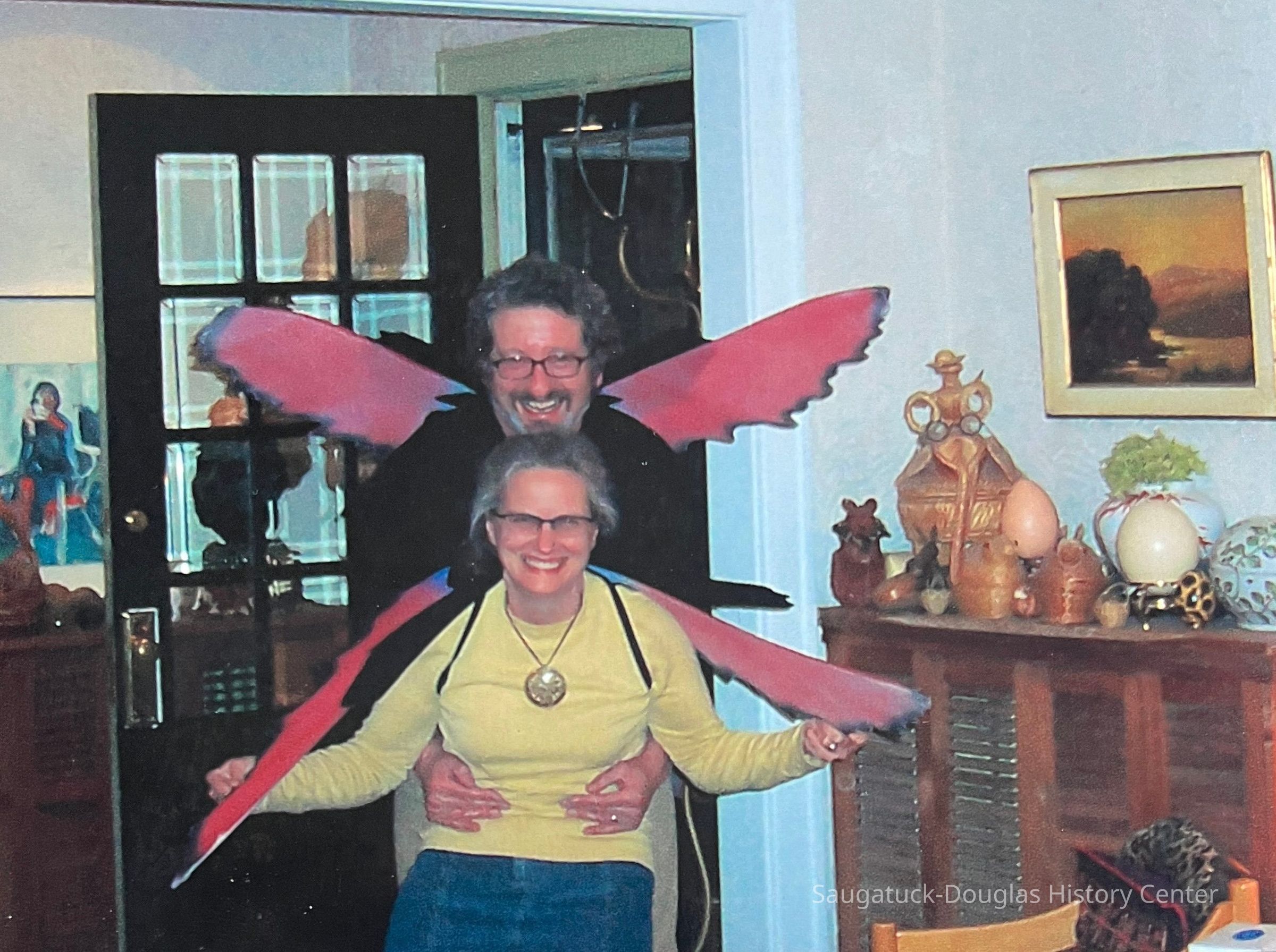 A. Woodblock artist and industrial designer Mary Brodbeck with John Brodbeck posed wearing the pink-red fairy wings (this photo was not taken the same day as the Chorus visit.