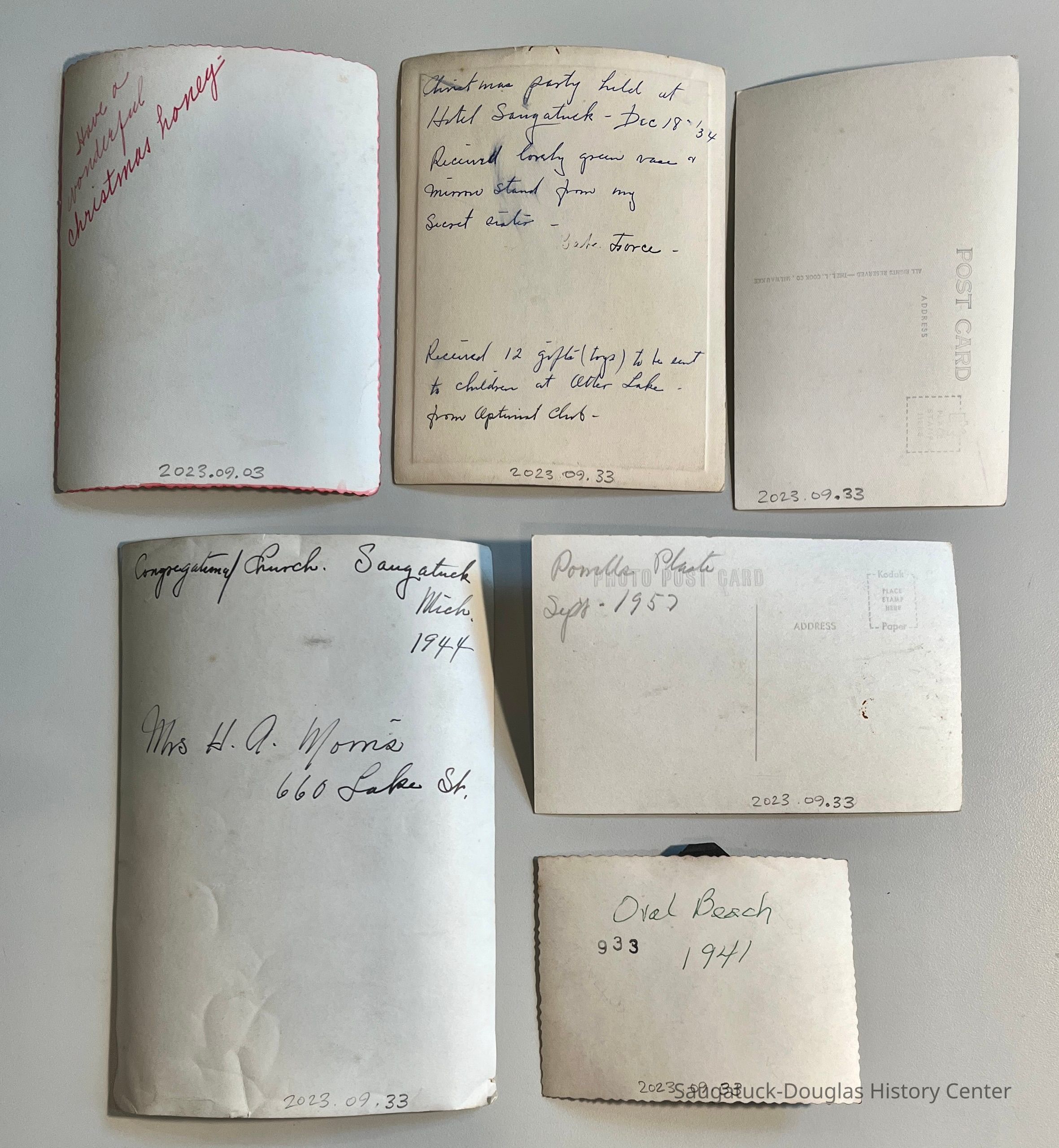 Hotel Saugatuck/Coral Gables 1934 photo Christmas card from Babe Force with note on reverse about toys collected for children at Otter[?] Lake from Optimist Club