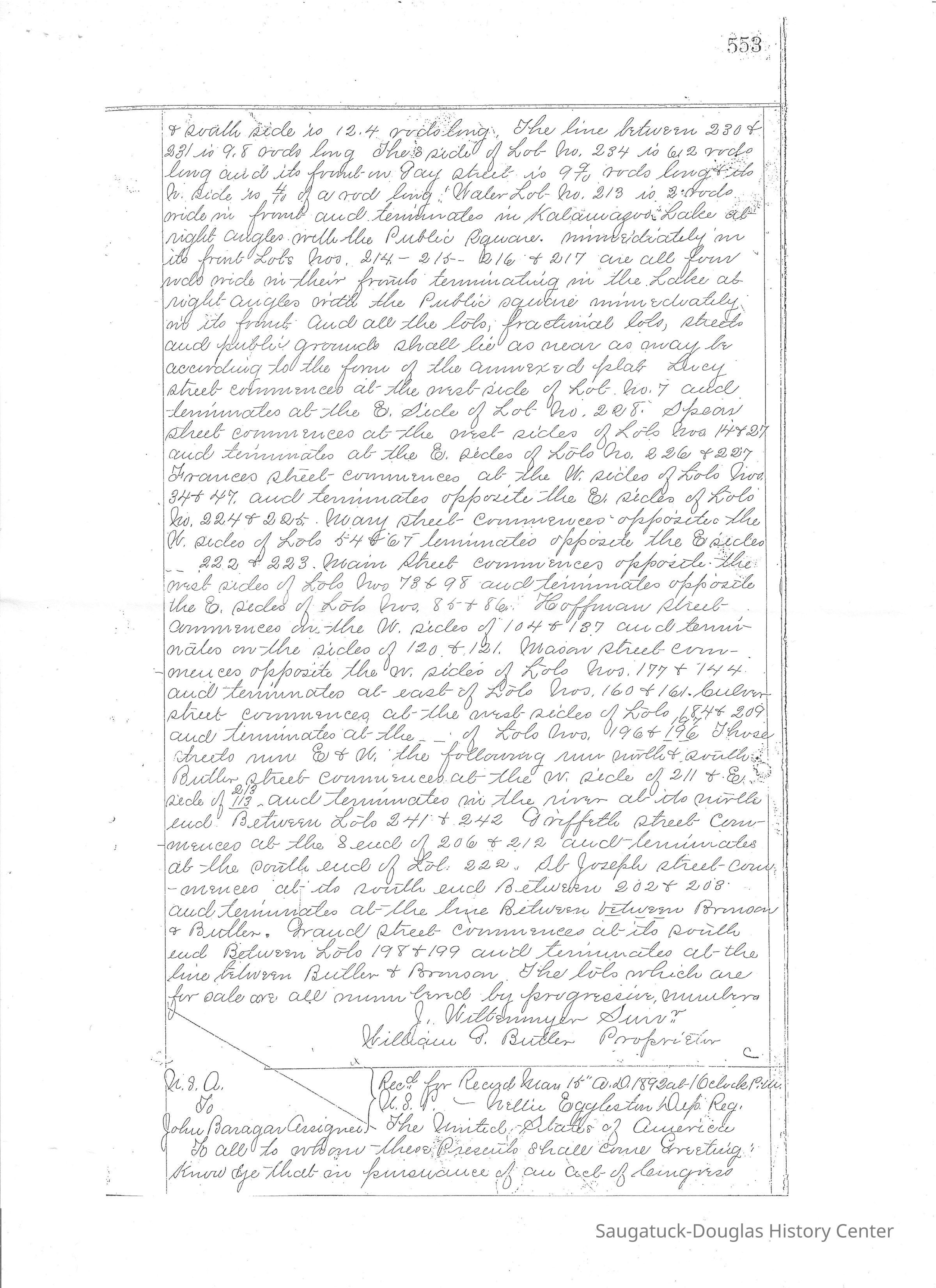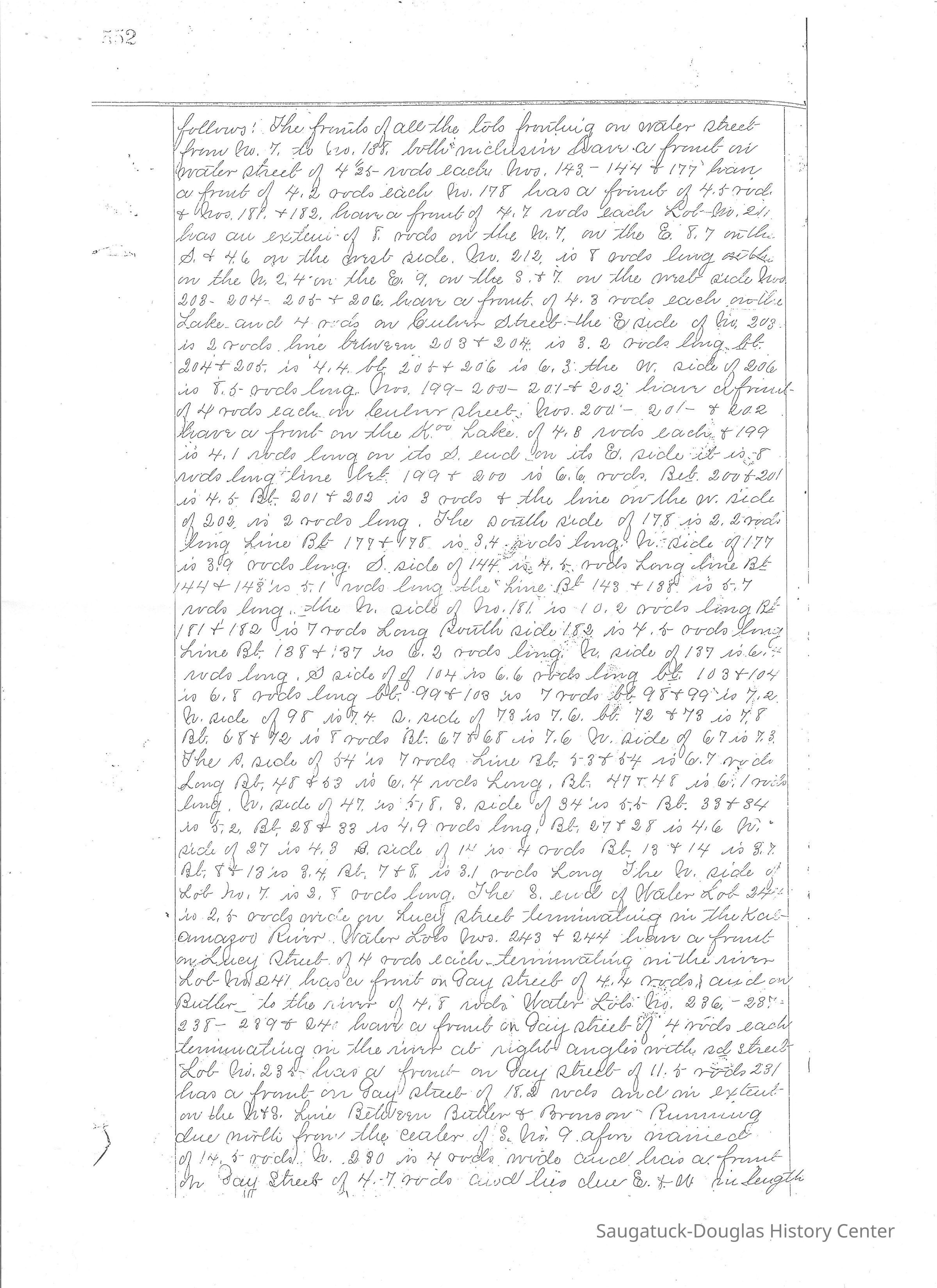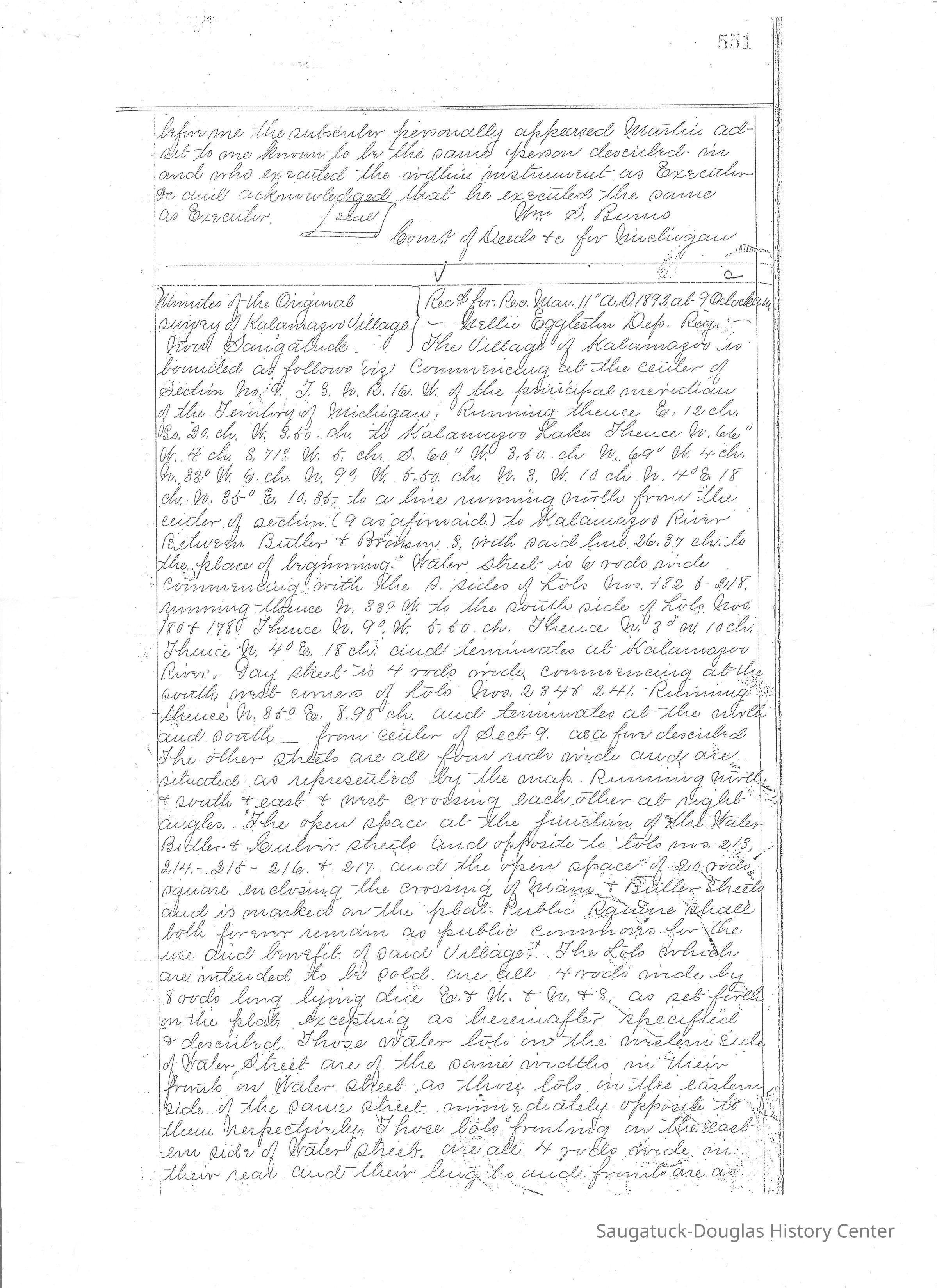 This 1893 document describes the physical and legal boundaries of the Village of Kalamazoo, that was founded with the name Village of Newark by William G. Butler, and today is known as Saugatuck. This description was a replacement created when it was discovered that the Butler’s original 1835 plat was missing. The 1893 document is held by the Allegan Register of Deeds office in Allegan, Michigan.