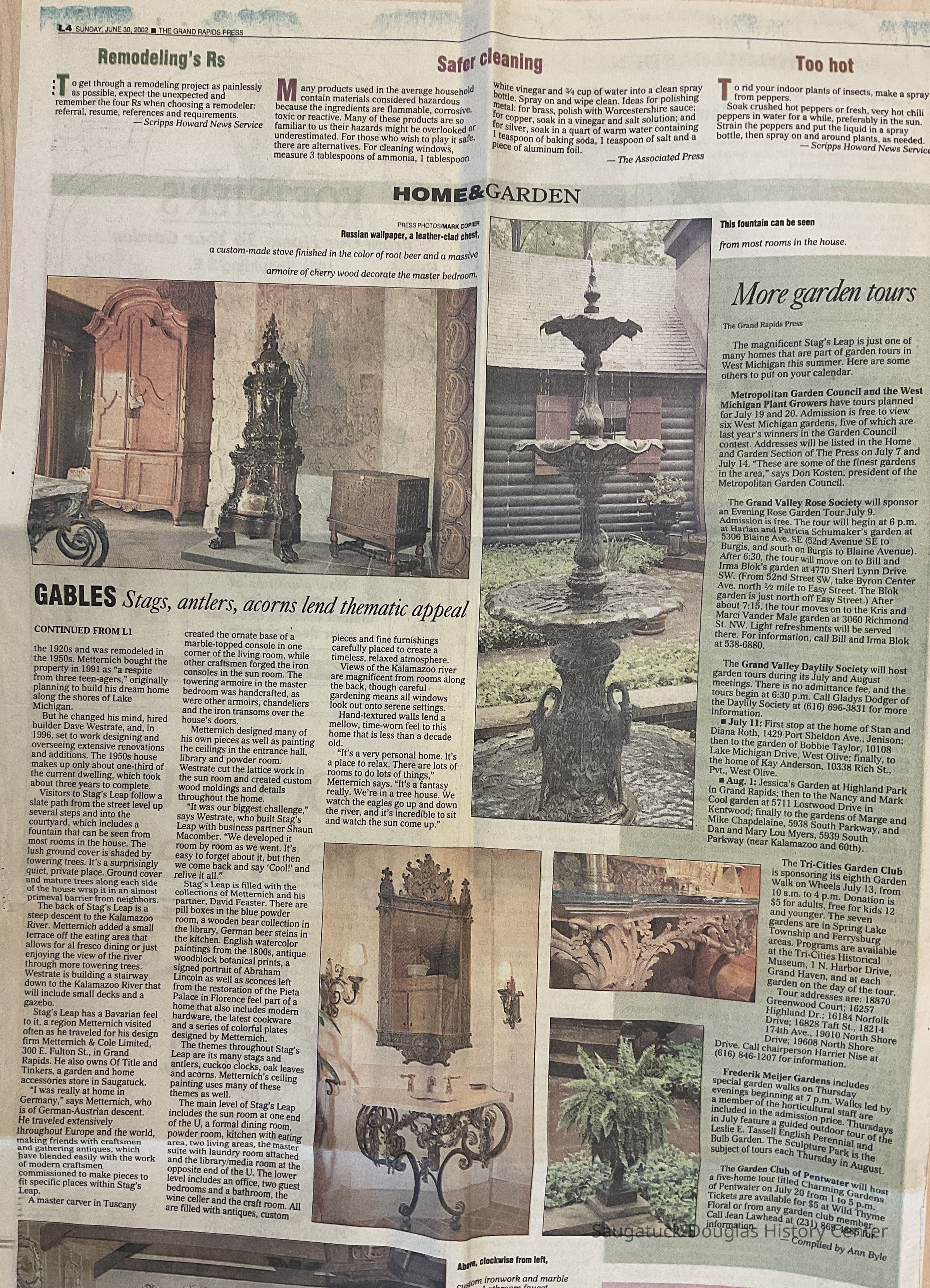 Newspaper article advertising area garden tours with a number of colored photos of the home at 995 Holland St. belonging to Dale Metternich of Saugatuck, MI. The house is known as Stag's Leap.