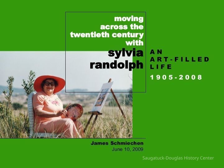 SYLVIA RANDOLPH “AN ART-FILLED LIFE” SDHS June 10, 2009 Presentation by James Schmiechen at the SCA “I think we could say that Sylvia, even in old age, did not slow down for a minute. Any time there was an opportunity to experiment with something new she grabbed it. She was always ready to run a new race in the art world--be it fabrics, furniture,costume, painting, and even food...She grew up to be...a woman who took advantage of the often limited but also increasingly open doors for women in a century of tremendous change.” -- Jim Schmiechen 6-10-09 While sharing photos of Sylvia through her ages and her work, Schmiechen outlined the cultural milieu which both influenced and in turn was influenced by her amazing artistic productivity. He visited every nook and cranny of her life in Saugatuck including her creative cooking and costuming. This one hour video will be a wonderful resource for art teachers and anyone interested in understanding this area icon in significant depth. The numerous photos shown in the program show up clearly in the video. Text by John Shack