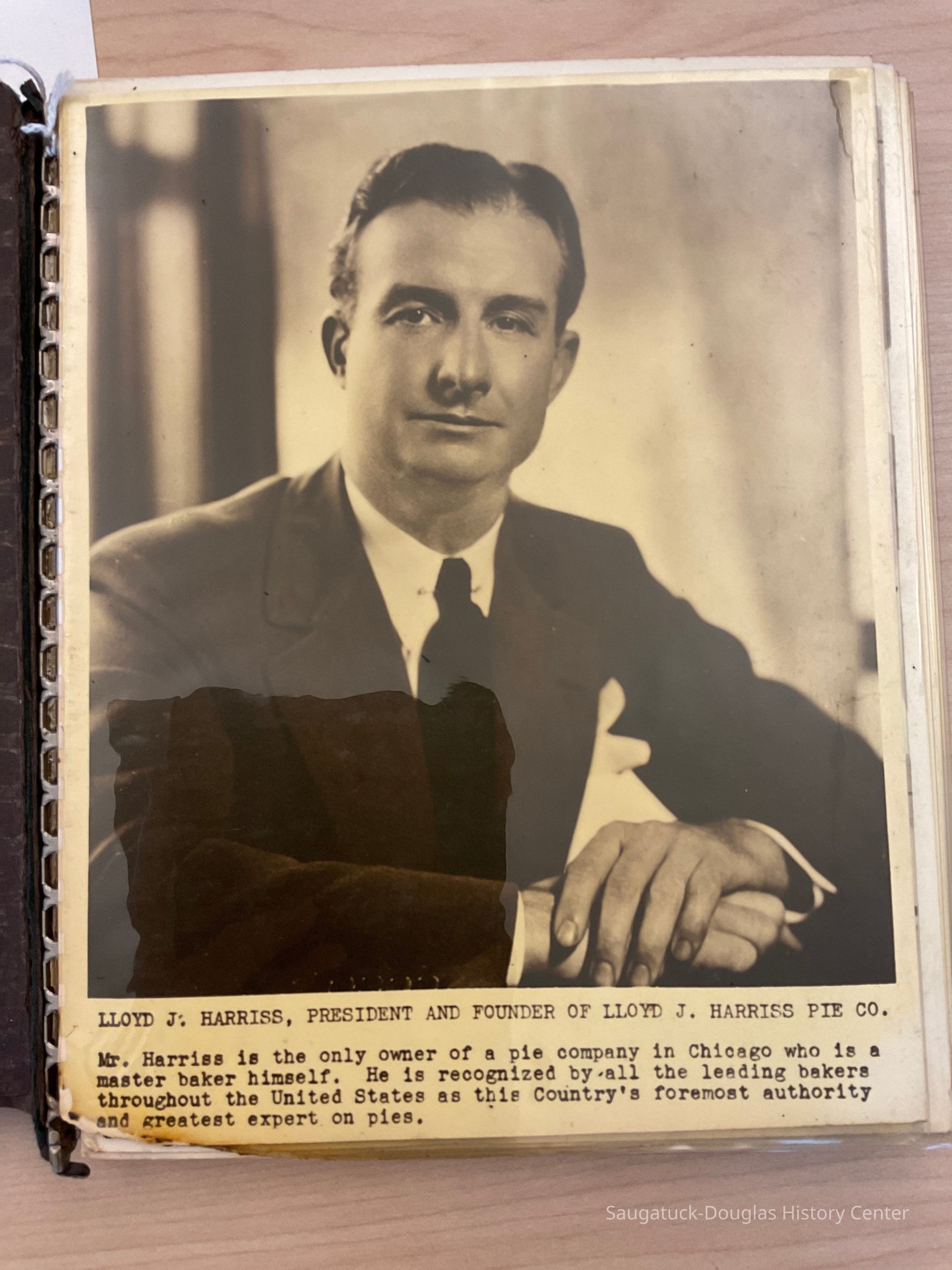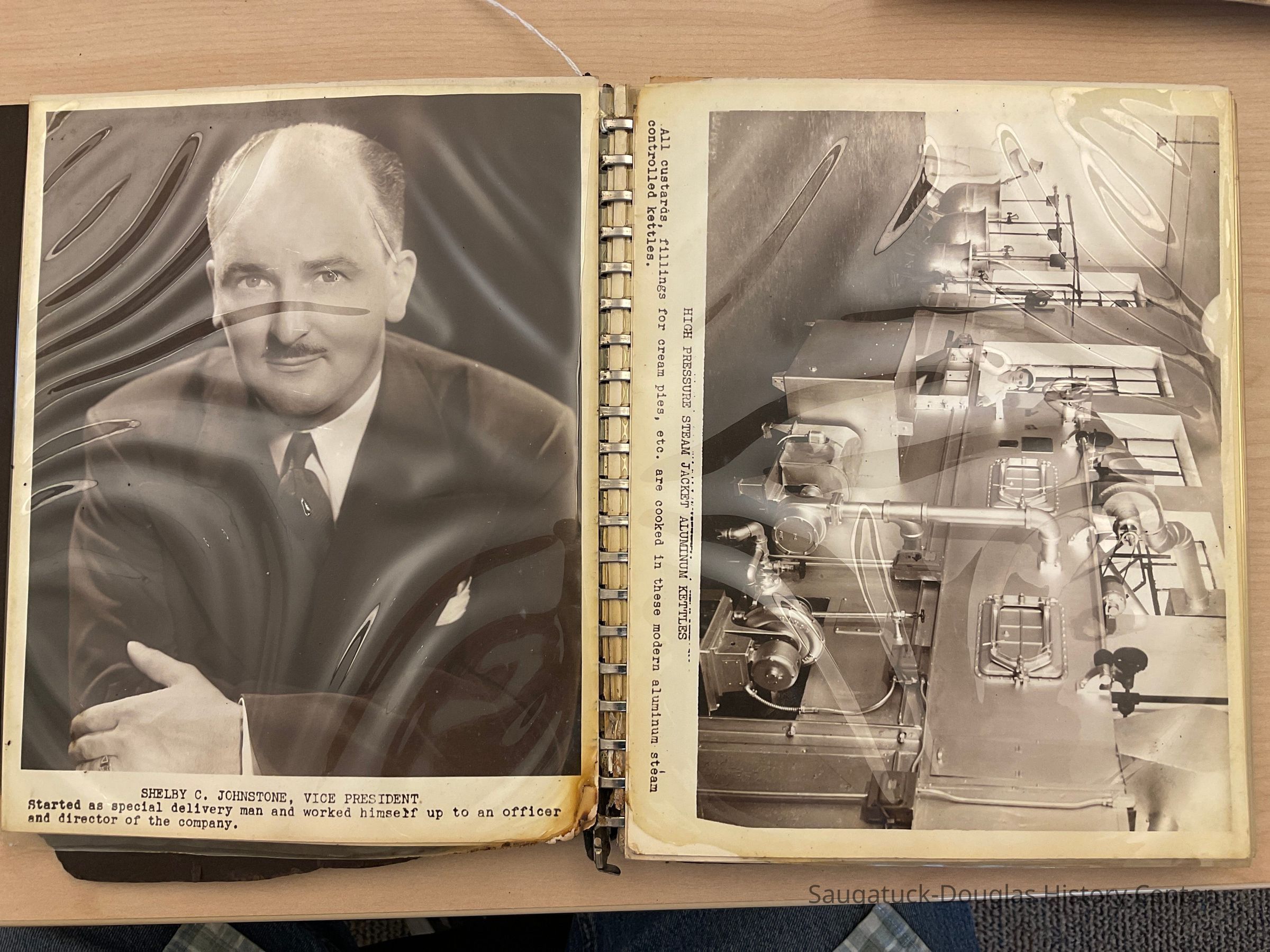 Scrapbook with photos of the Harris Pie factory in Saugatuck, MI including photos of Lloyd J. Harris, president and founder of Lloyd Harris Pie Co. Also Shelby C. Johnstone, Vice president, who started as a special delivery man and worked himself up to an officer and director of the company. Included are 27 black and white 8x10" photographs of all aspects of the running of the factory with captions.