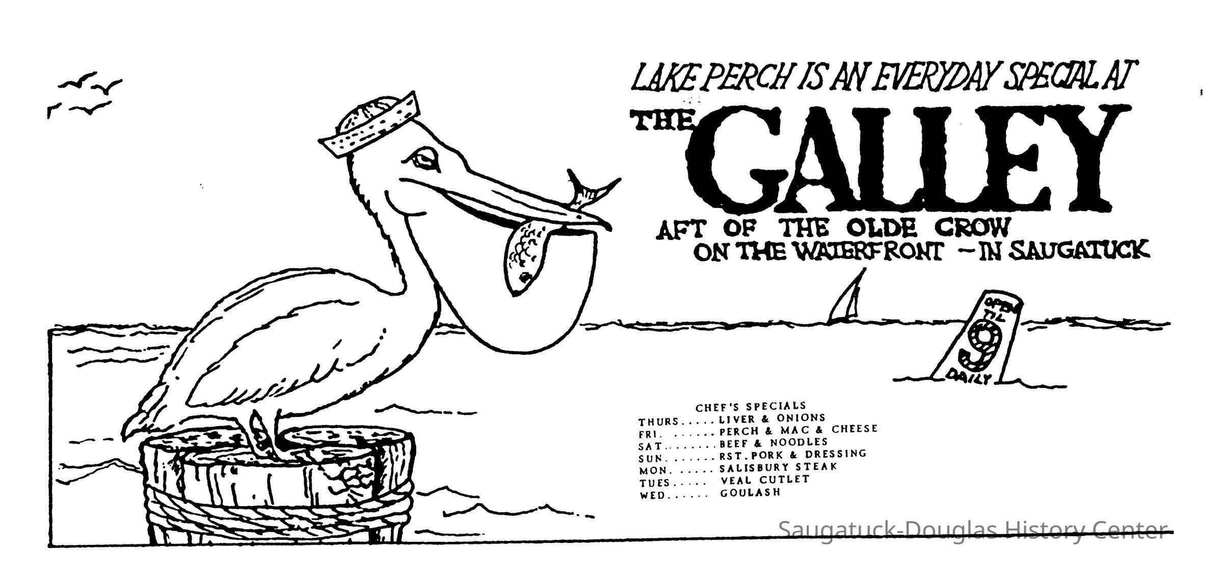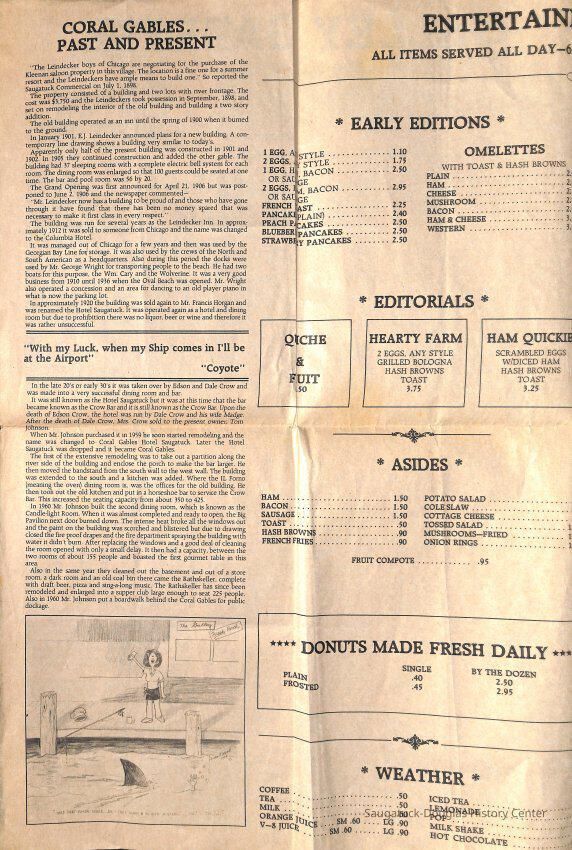 Broadside newsprint menu and newsletter titled the "Galley Gazette" with information about history and events at the Coral Gables bar, restaurant, hotel, and marina. Mention of 25th anniversary celebration planned to commemorate Thomas Johnson's purchase of the Saugatuck business in 1958. Articles on history of Coral Gables restaurant group in East Lansing and across Michigan included along with feature on Saugatuck/Douglas history then and now.