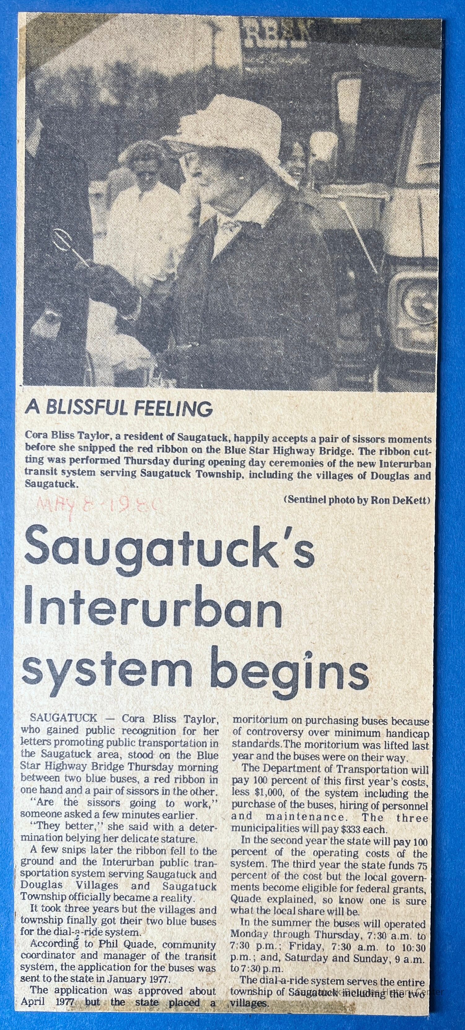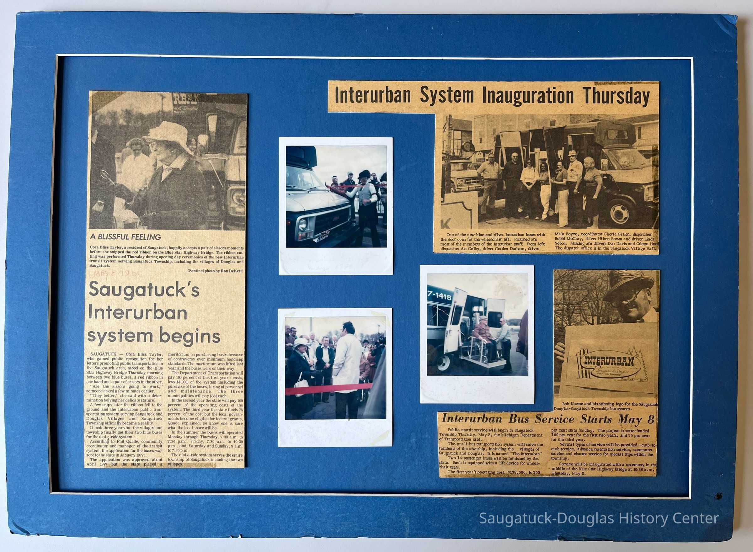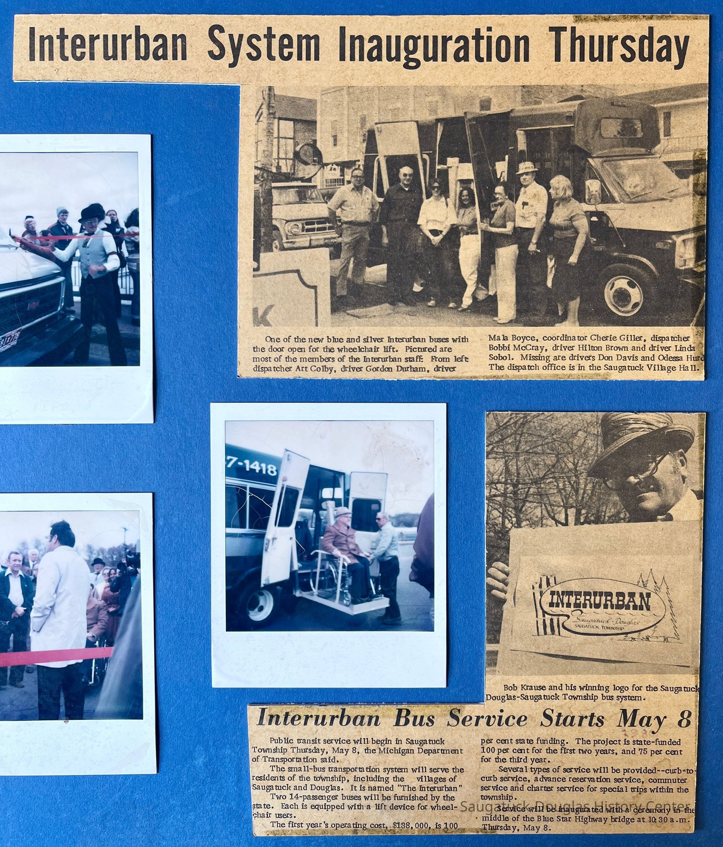 Documents the success of artist Cora Bliss Taylors letter-writing campaign to establish public transportation in the township. Commercial Record newspaper clipping includes photos of Cora Bliss Taylor, Interurban dispatcher Art Colby, driver Gordon Durham, driver Mala Boyce, coordinator Cherie Giller, dispatcher Bobbi McCray, driver Hilton Brown and driver Linda Sobol (not shown drivers Don Davis and Odessa Hurd) and Rob Krause with his winning logo design. The first dispatch office was in the Saugatuck Village Hall.