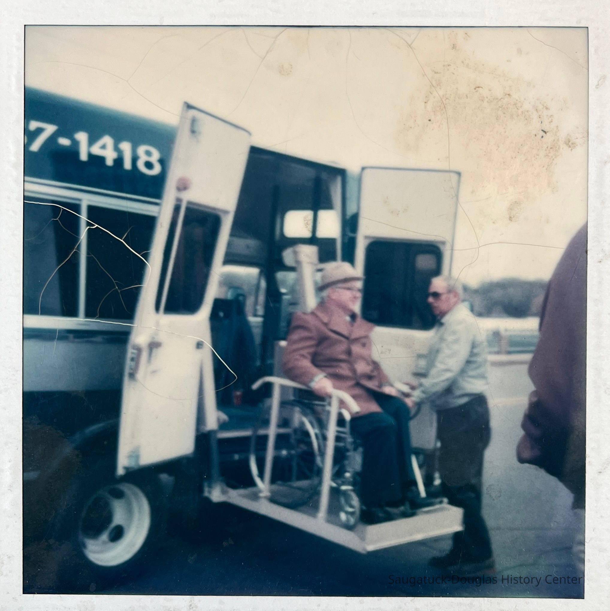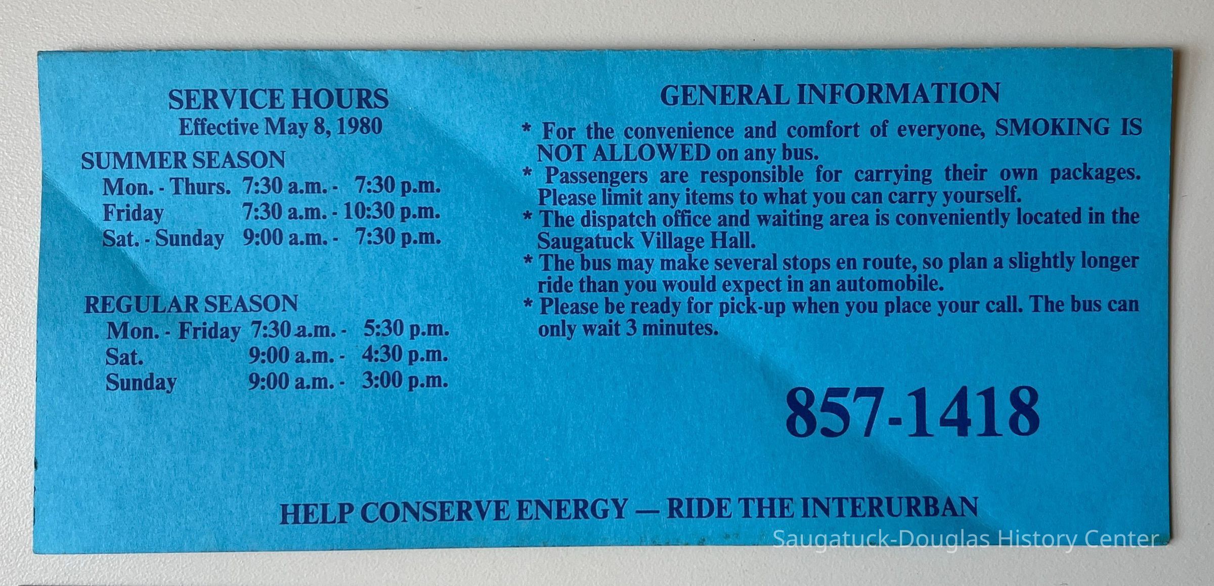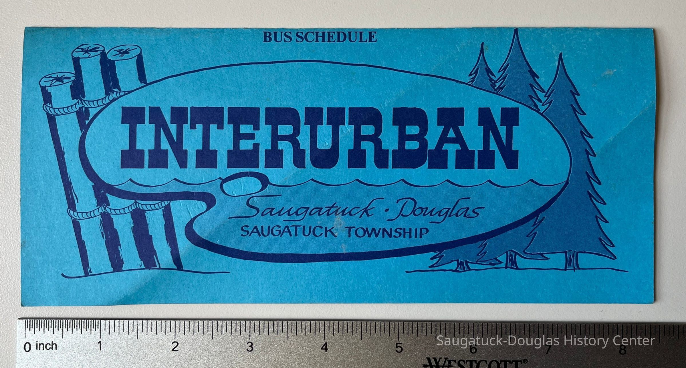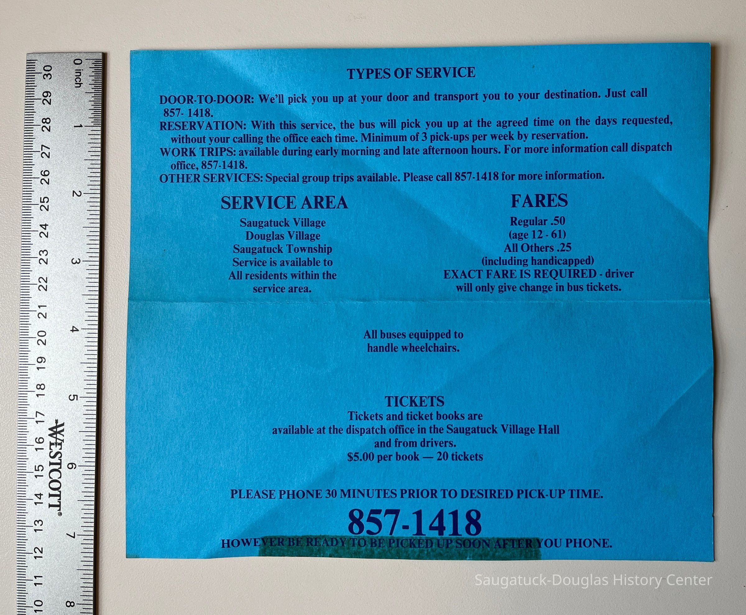 Documents the success of artist Cora Bliss Taylors letter-writing campaign to establish public transportation in the township. Commercial Record newspaper clipping includes photos of Cora Bliss Taylor, Interurban dispatcher Art Colby, driver Gordon Durham, driver Mala Boyce, coordinator Cherie Giller, dispatcher Bobbi McCray, driver Hilton Brown and driver Linda Sobol (not shown drivers Don Davis and Odessa Hurd) and Rob Krause with his winning logo design. The first dispatch office was in the Saugatuck Village Hall.