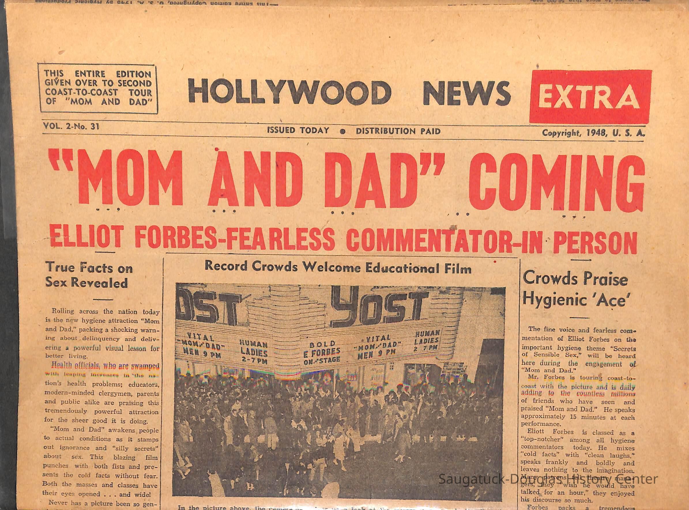 Newspaper broadside titled Hollywood News, Volume 2, No. 31. "This entire edition given over to second coast-to-coast tour of "Mom and Dad" a film described as a "hygene attraction...packing a shocking warning about deliquency and delivering a powerful visual lesson for beter living...by stamping out silly secrets about sex."