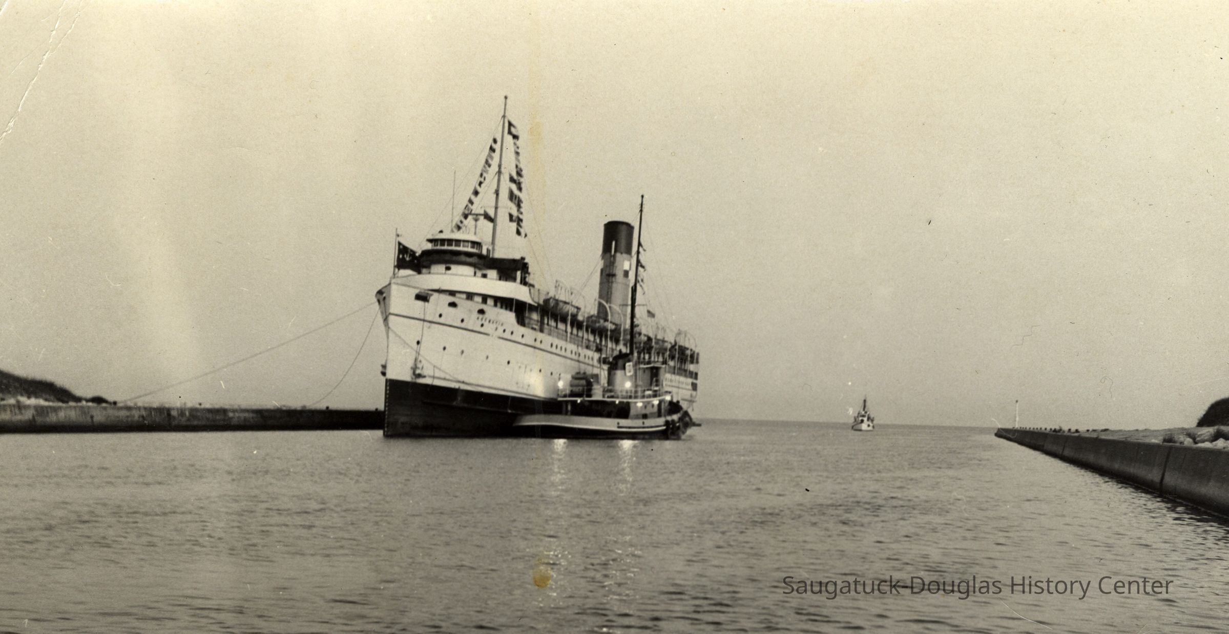 The S.S. Keewatin, with the assistance of tug boats, enters the Kalamazoo on its way to Tower Marine in Douglas.
