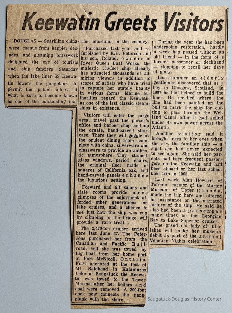 This image was featured as History Mystery #19 with the solution: The Keewatin was the inspiration of R. J. Peterson and was purchased by the Peterson family in 1967 to become a floating museum.