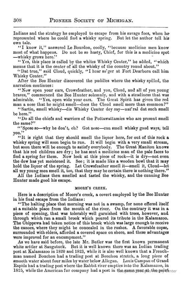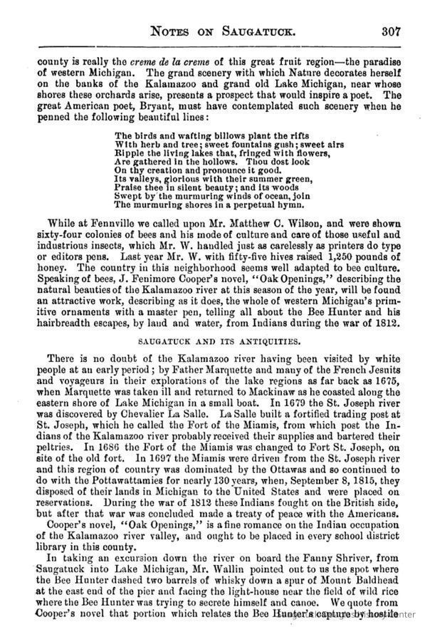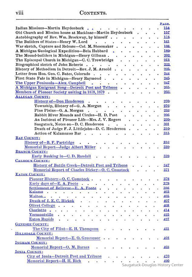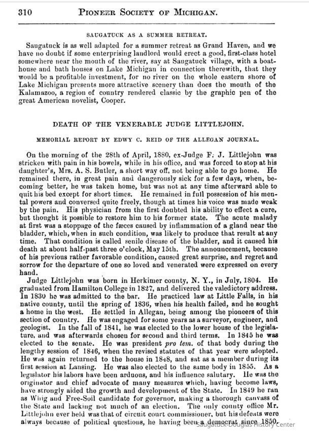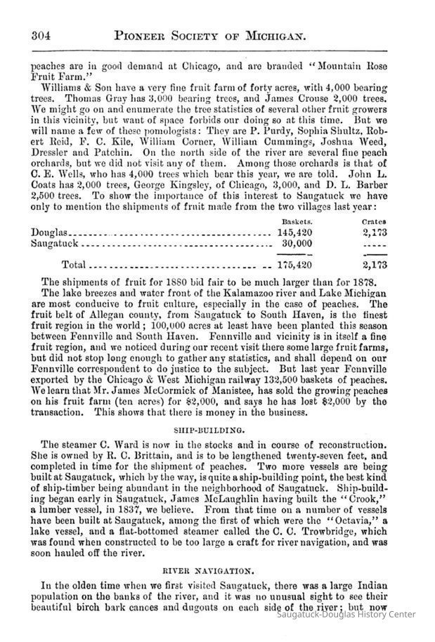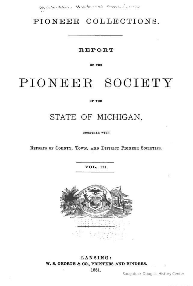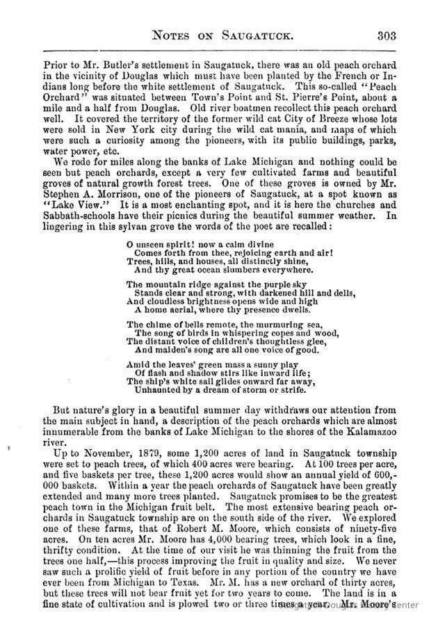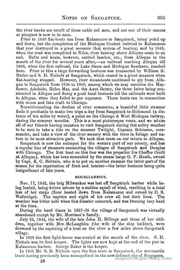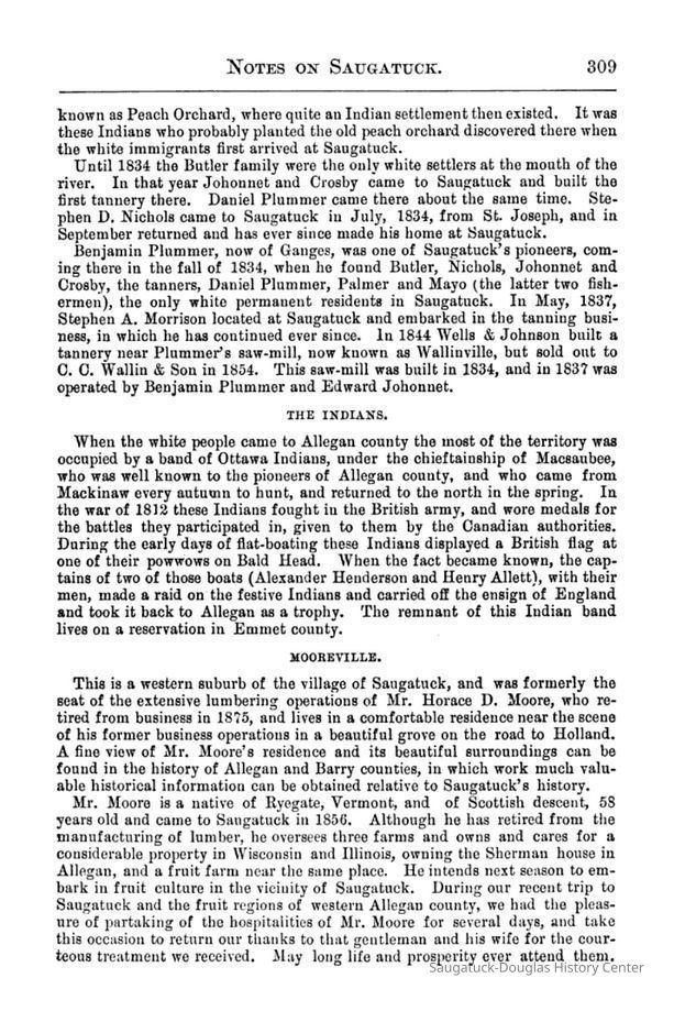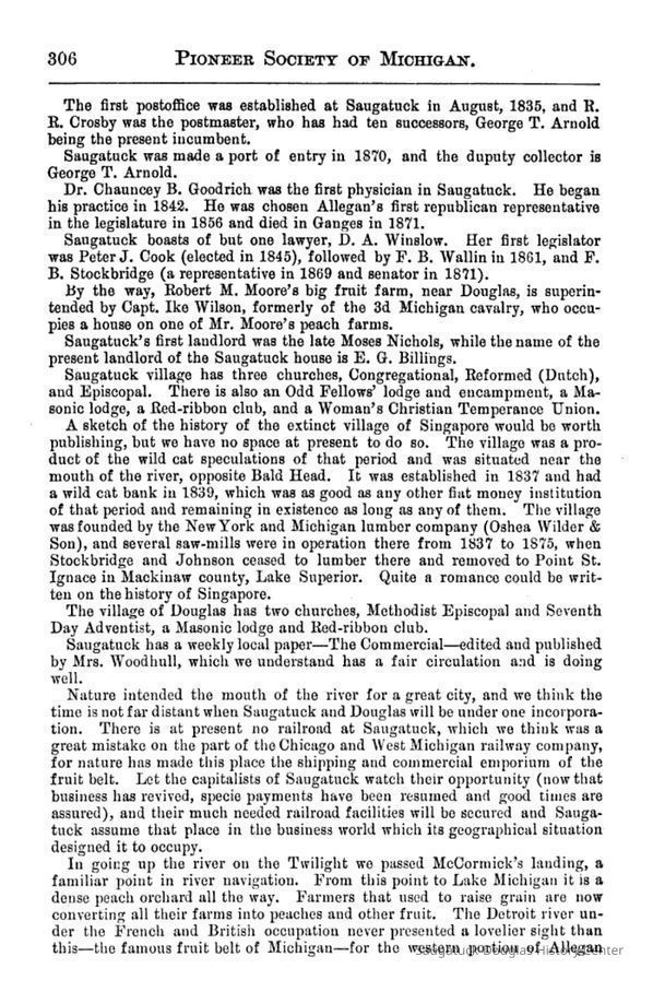 A flowery, flattering, early account of municipal firsts (first post office, etc.), early business leaders and industries when lumbering was being replaced by fruit growing and — it is speculated — tourism. The pro-Capitalist, business-booster tone is typical of the late 1890s. Many of accepted historic "truths" about the area are based on this (and other contemporary) accounts that lionize the succussful. The author, Donald C. Henderson of Allegan, states that his first trip to the mouth of the Kalamazoo occurred in 1841, 39 years before this text was published.